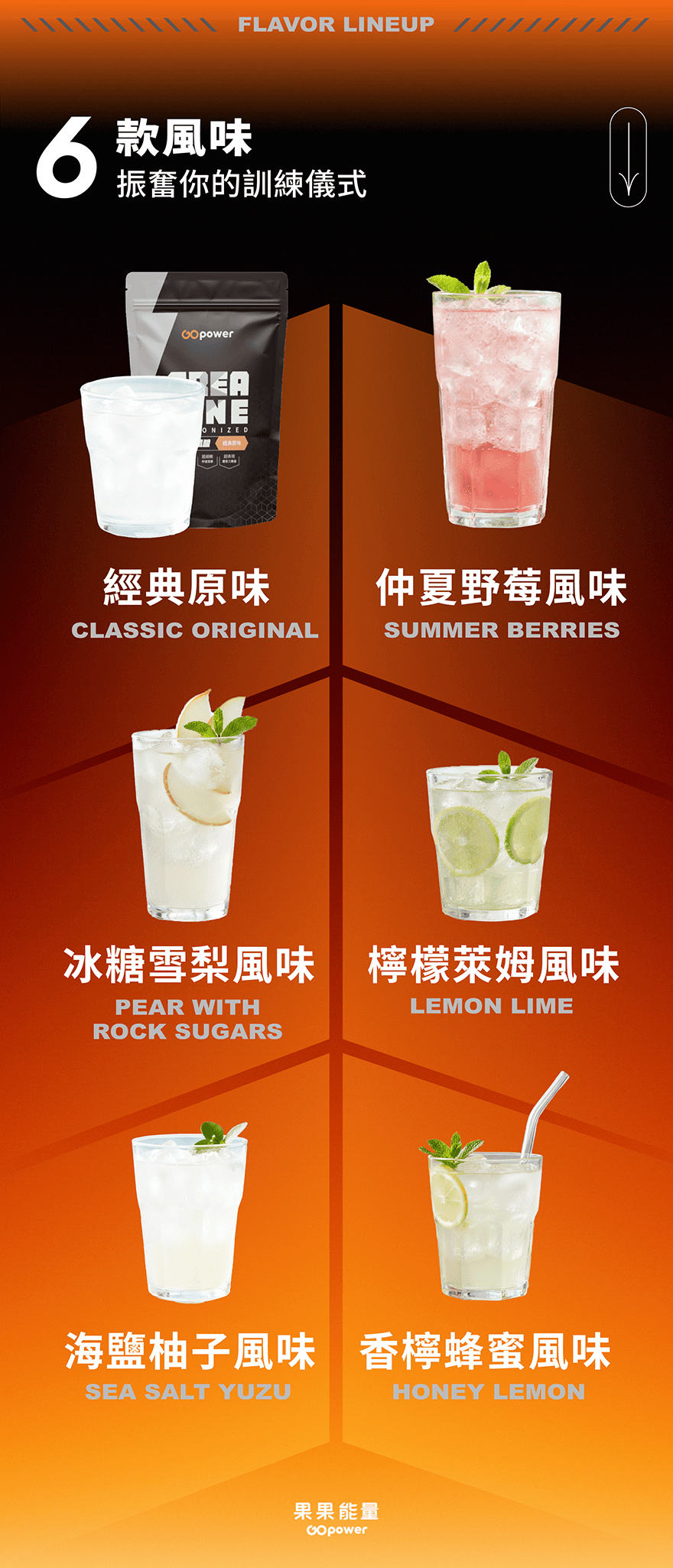 Creatine 微粉化肌酸【檸檬萊姆】420g - 果果能量 GOpower【品名】:微粉化肌酸-檸檬萊姆【淨重】:420克【保存期限】:2年【產地】:臺灣【建議食用方式】:➤ 經典原味:每次取 5g(約 1 平匙),以「粉:水 = 1:50」的比例加入冷水中充分搖勻後飲用。➤ 調味系列:每次取 7g(約 1.4 平匙,含約 5g 肌酸),以「粉:水 = 1:50」的比例加入冷水中充分搖勻後飲用。● 量匙僅供參考,建議以磅秤秤量以確保份量精準。● 水量可依個人口味調整,建議沖泡後盡快飲用。本產品若有少量沉澱屬正常現象。● 肌酸每日建議攝取約 5g,實際攝取量可依個人運動狀況或需求調整(調味款每 7g 約含 5g 肌酸)。● 建議於運動前 30 分鐘飲用酸酸甜甜的莓果口味,是清新的夏日回憶,可加入水中飲用或與其他飲品一同調配使用,清爽口味豐富你的訓練時刻果果能量微粉化肌酸產品特色:1. 零禁藥檢出:通過運動禁藥檢測,敬請放心補充,陪伴你面對各種挑戰。 2. 微粉化技術:果果能量微粉化肌酸經過特殊處理,顆粒極細、遇水快速分散。 3. 素食可食用:本產品以水合技術製作,不含動物性來源,純素者可安心食用。 除了經典原味可以自行調飲外,獨家推出調味款肌酸,每次補充都像在喝飲料,豐富你的訓練日常。 肌酸是什麼? Creatine 肌酸是由精胺酸、甘胺酸和甲硫胺酸等三種胺基酸組合而成的天然化合物。 肌酸的最佳使用時機是什麼時候? 1. 訓練前 30 分鐘是使用肌酸的最佳時機 2. 也可以在訓練後飲用肌酸,並可搭配乳清蛋白 使用肌酸有沒有哪些注意事項? 1. 建議依照循環週期補充 2. 使用肌酸時應增加水分攝取,避免脫水 3. 建議與碳水化合物及蛋白質一同使用 *肌酸不適合一般人食用。如擬食用,須在醫師、營養師或專業人士之指導下使用。使用不當,可能產生之副作用包括:造成肌肉裂傷;產生體水滯留,增加心臟負荷;腎臟功能不佳者產生腎衰竭;飲水量增加造成電解質稀釋而引起抽筋或嘔吐;腸胃不適(下痢)*本產品已投保產物產品責任險一千萬元,投保金額非為理賠金額