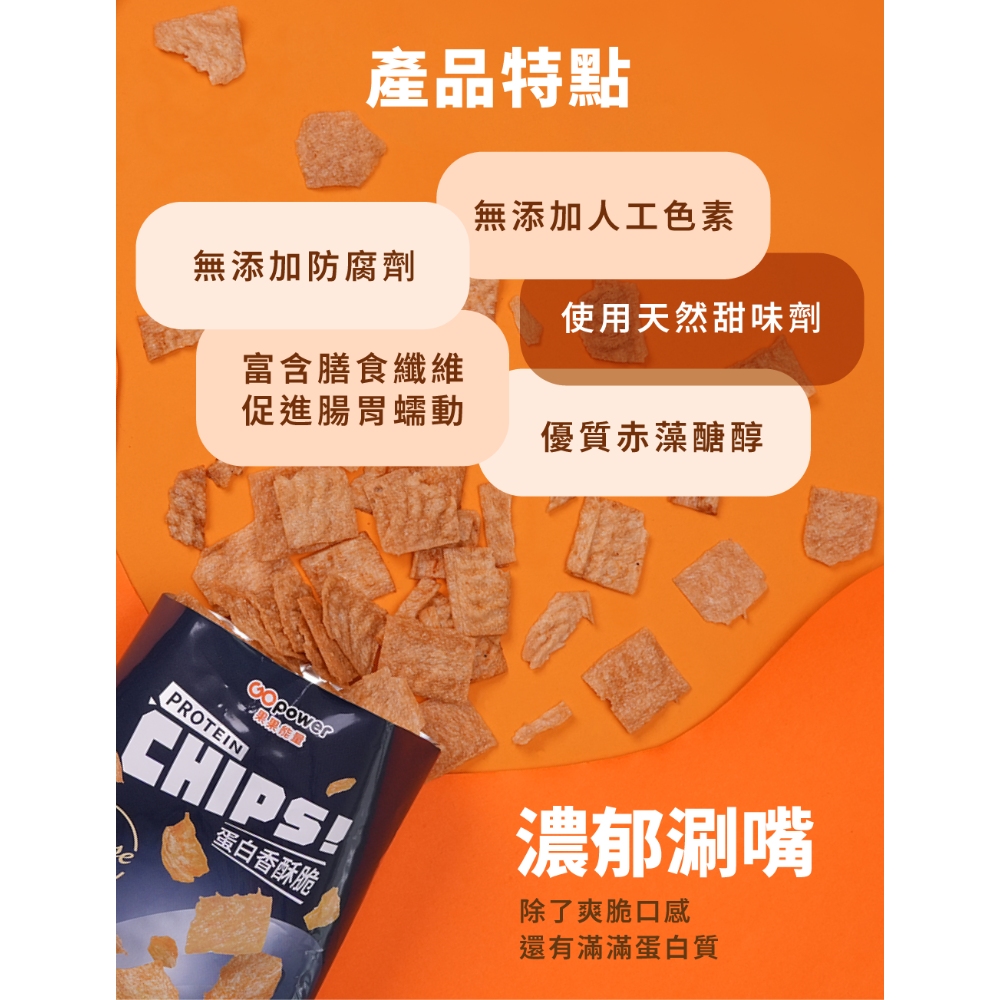 每包即含有16克蛋白質,使用天然甜味劑-赤藻醣醇取代一般精緻糖。採多種植物蛋白低溫烘烤製作而成,可食。富含膳食纖維,促進腸胃蠕動果果能量蛋白香酥脆是非油炸的健康零食,使用植物蛋白低溫烘烤製成,片片都是讓人停不下來的香、酥、脆。