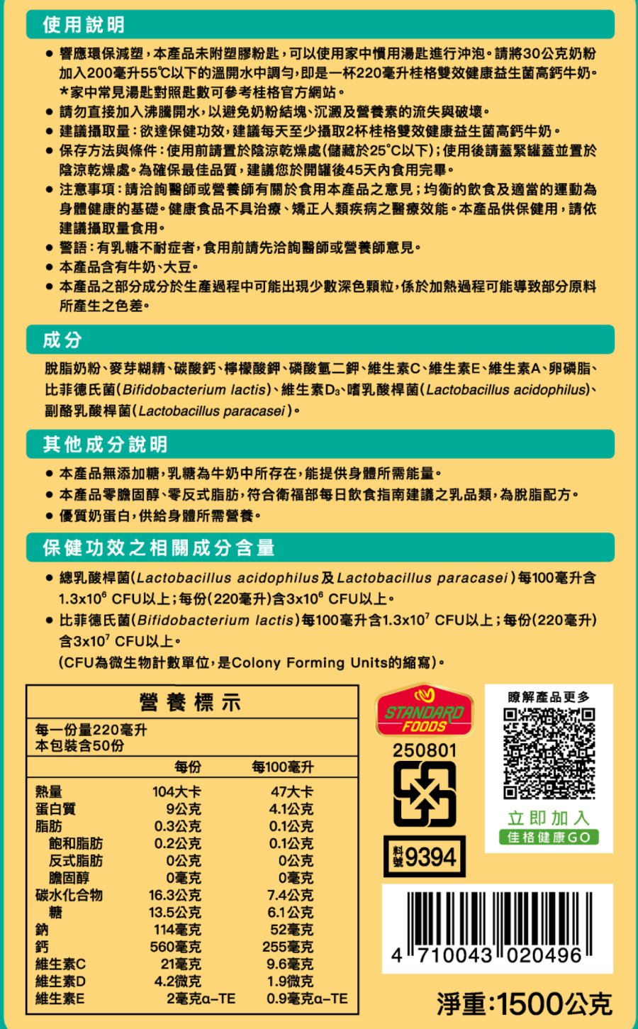 桂格雙效健康益生菌高鈣奶粉 1.5kg