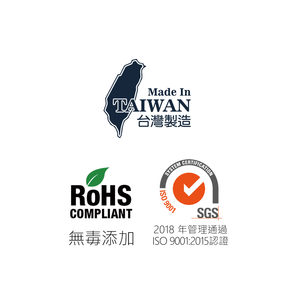 品質保證:全程台灣製造,品質管理ISO9001:2015認證,材質全數通過SGS無毒性檢驗。