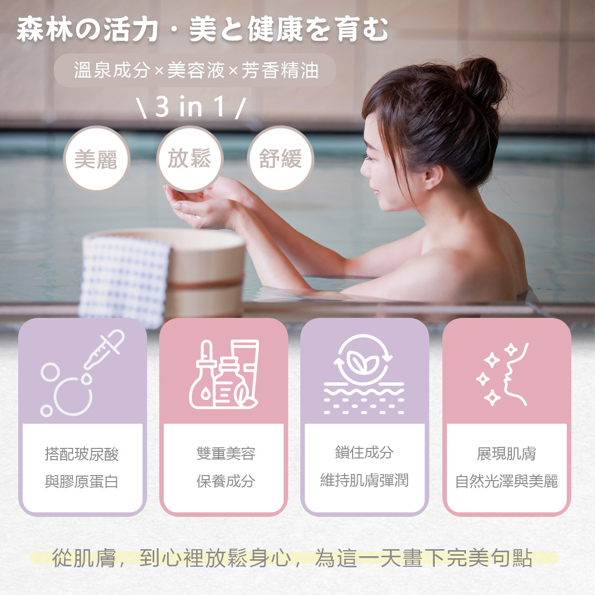 溫泉成份x美容液x能量精油洗去疲憊 迎接新活力櫻花浪漫清甜,像春日微風般輕柔展開,洗去停滯與疲憊感。搭配紫羅蘭細緻優雅的花調,讓思緒沉澱、心緒回到穩定,為新的開始,留下一段安定而清晰的空間。櫻花 × 紫羅蘭● 櫻花|清新花香,象徵著轉化與新的機會,帶來輕盈、明亮的感受。● 紫羅蘭|優雅花調,讓思緒回到清晰、穩定的狀態,提升運勢。美麗、放鬆、舒緩 3 in 1✓ 碳酸氫鈉溫泉元素,彷彿浸在天然的化妝水裡,滋潤光滑柔嫩✓ 頂級芳香精油,療癒身心靈,舒緩疲憊緊張情緒✓ 膠原蛋白與玻尿酸,一次擁有!✓ 奢華享受,放鬆身心,為一天畫下完美句點✓ 獨立包裝,外出旅遊攜帶方便,隨時隨地享受泡湯樂趣