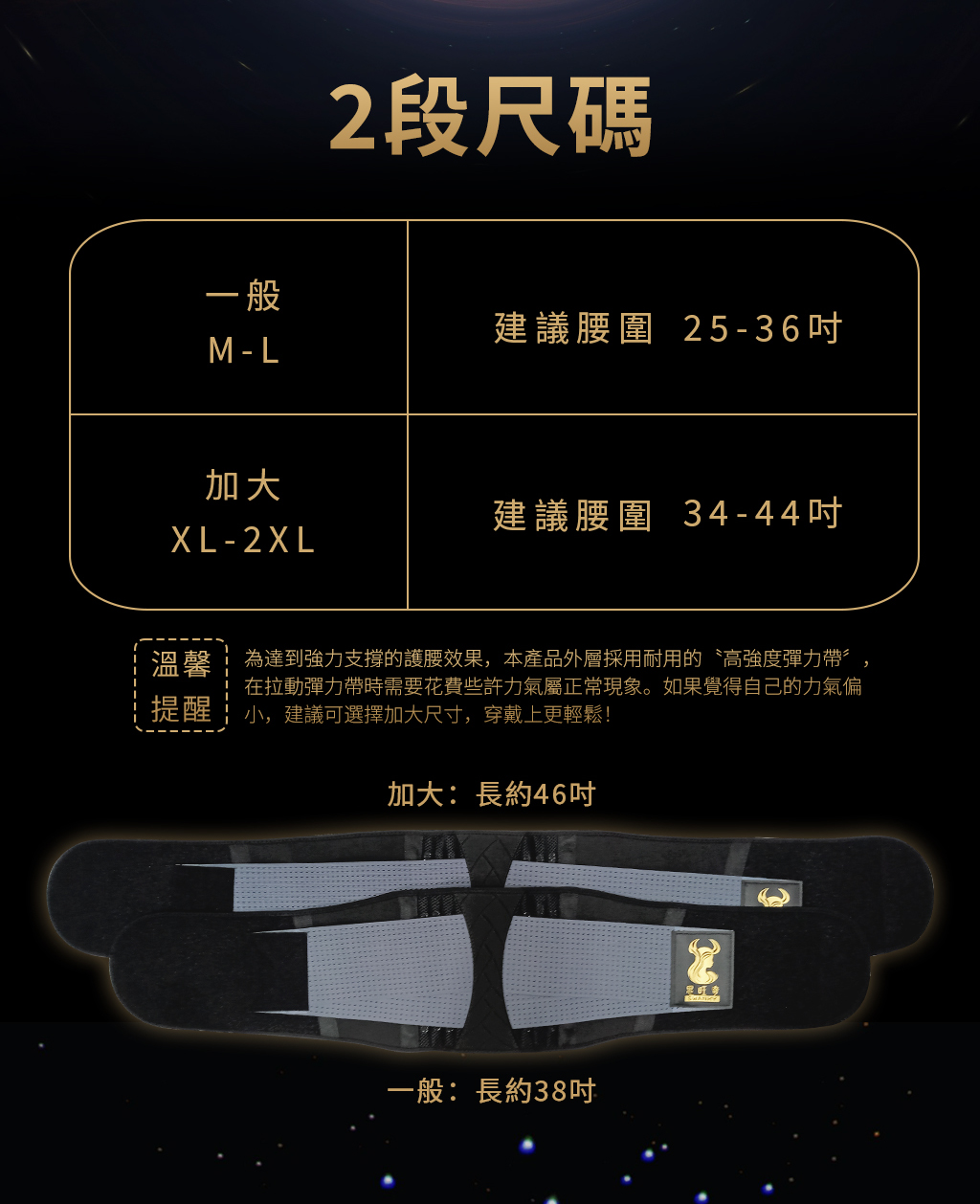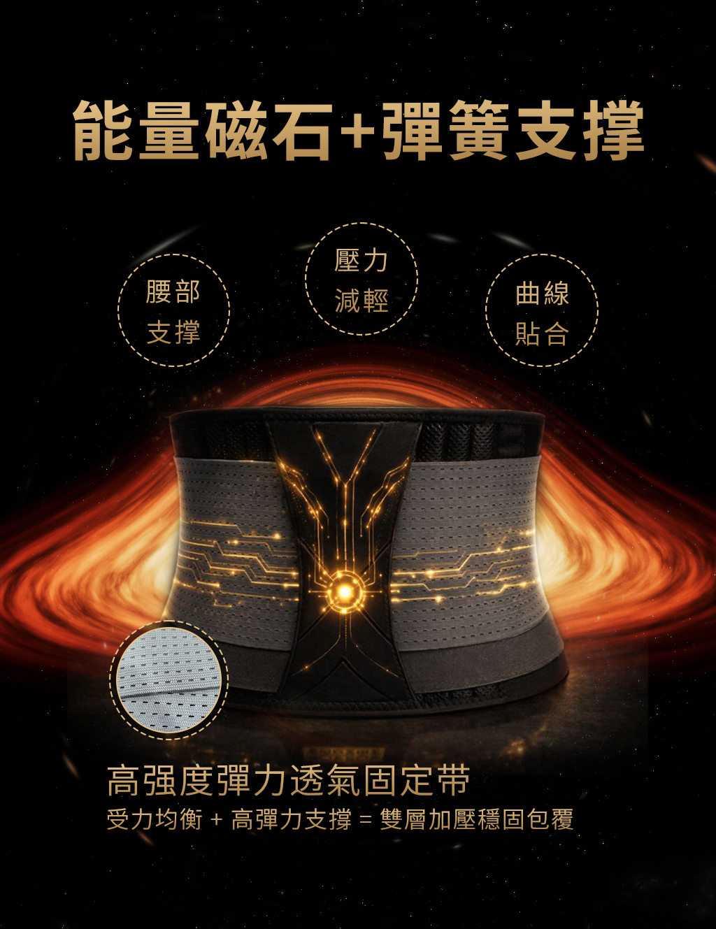 【商品特色】◉結合石墨烯、能量鍺、EMS傳導紗… 等可釋放遠紅外線能量的高科技機能面料,並藉由量子賦能,幫助人體健康有活力。 ◉內層含8支磁石+10支高彈力彈簧,幫助強化支撐;外層採耐用的高強度彈力帶,支撐並保護腰部!◉符合人體工學貼合曲線。◉透氣舒適、穿脫方便、堅固耐用。◉背部超寬設計,強化支撐、包覆減壓。◉通過多項TTRI檢測,台灣製造品質有保障。【商品規格】◉材質✦主體:80%聚酯纖維 (內含石墨烯、能量鍺、EMS傳導紗)、10%尼龍、10%彈性纖維✦高強度彈力帶:70%聚酯纖維、30%彈性纖維◉尺寸✦一般 (M-L):100x21cm±5%;建議腰圍25 ~ 36吋✦加大 (XL-2XL):120x21cm±5%;建議腰圍34 ~ 44吋◉適穿性別:男女皆可◉產地:台灣