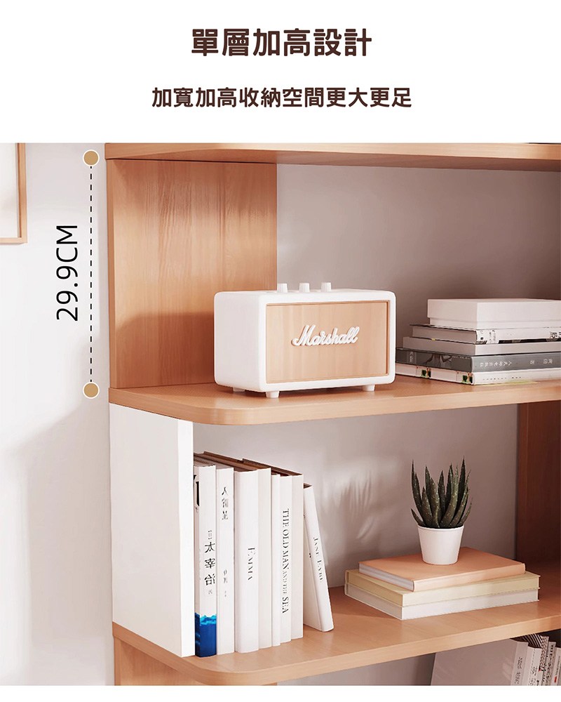 三明治結構板材防油防水、耐磨耐刮,硬物刮擦不留痕;邊緣圓潤打磨,避免磕碰受傷;雙色可選滿足不同裝修需求,既是書架也是裝飾櫃。
