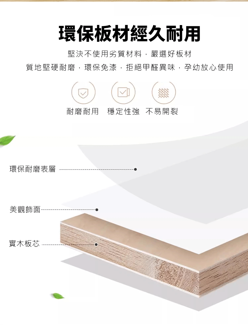 三明治結構板材防油防水、耐磨耐刮,硬物刮擦不留痕;邊緣圓潤打磨,避免磕碰受傷;自行安裝設計簡單快捷,租房族也能輕鬆組裝。