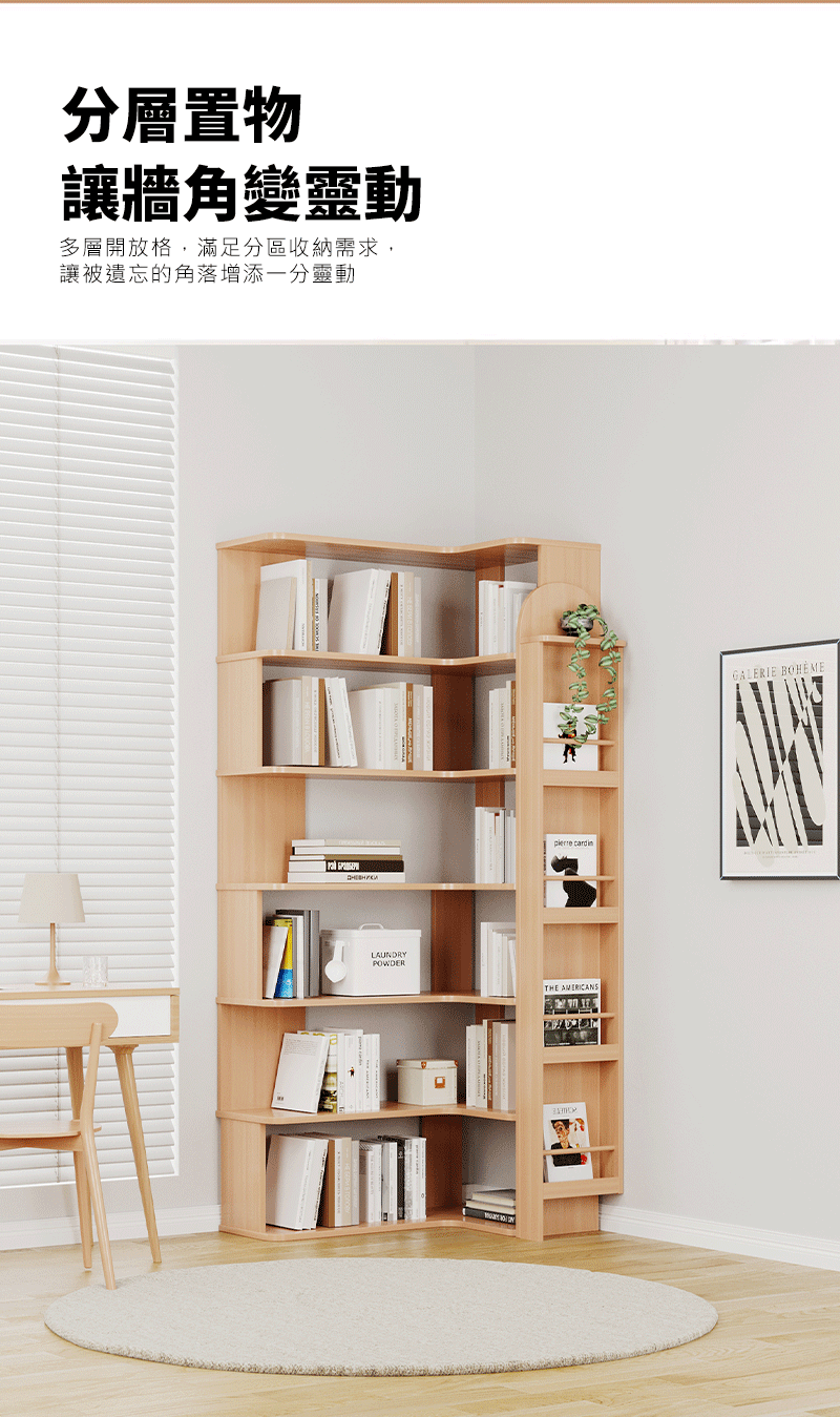 多層不規則收納空間可容納上百本書籍,同時擺放玩具、飾品;單層加高設計(29.9cm)可放大繪本、收納箱;貼牆踢腳線設計緊貼牆面,不浪費 1cm 空間,小戶型、租房族必備。