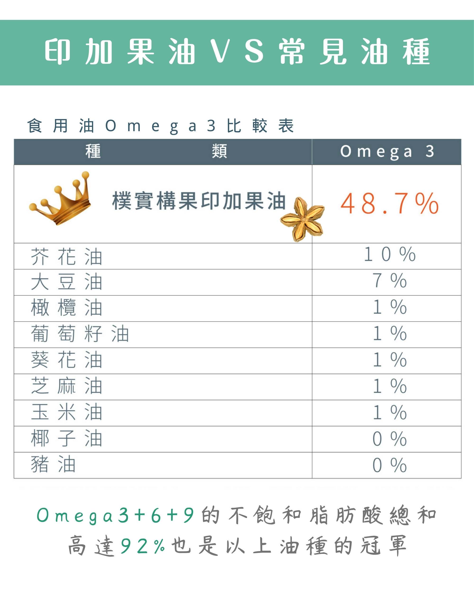 每一份量10毫升 本包装合25份 項目 每份 每100毫升 熱量 83.4大卡 834.3大卡 蛋白質 0克 0.0克 脂肪 9.3克 92.7克 鲍和脂肪酸 0.6克 5.8克 反式脂肪酸 0克 0.0克 碳水化合物 0克 0.0克 糖 0克 0.0克 钠 0毫克 0.0毫克 OMEGA3 - 48.7克/100毫升 OMEGA6 - 36.1克/100毫升 OMEGA9 - 7.1克1100毫升