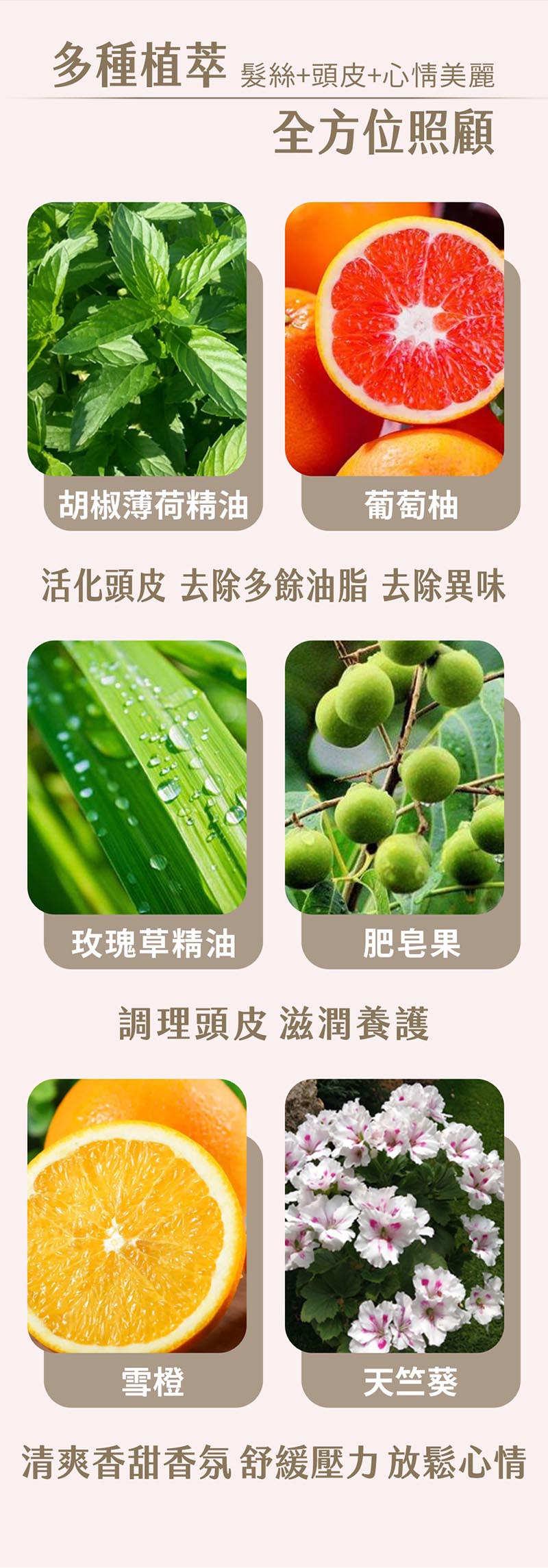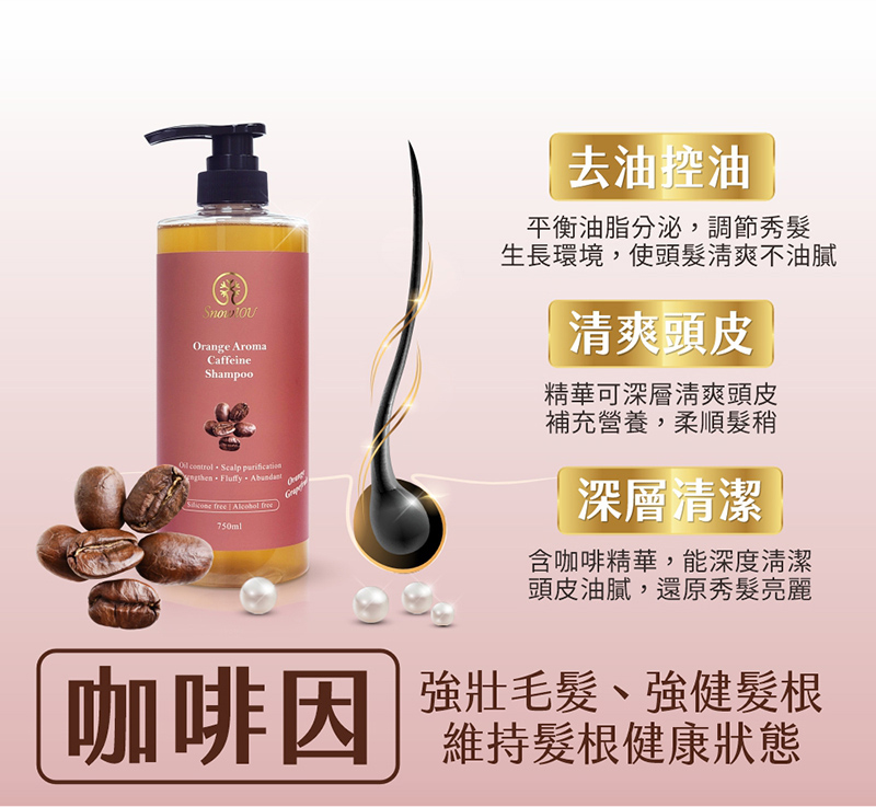以多種植萃精油為基底,深層清潔頭皮及控油;添加水解珍珠,滋潤調理頭皮,結合咖啡因,活化滋養髮質,強健髮絲,使頭髮蓬鬆柔順、賦活秀髮煥然一新。
