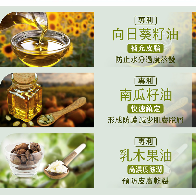 針對曬傷、醫美術後的全效急救霜,有效提升肌膚緊緻與彈性,直接加強補水潤澤。快速急救恢復肌膚彈性,專利成分搭配生命之樹-乳木果油,厚敷深層修護、薄擦保水滋潤,一次完成,全身適用。五大特色專利向日葵籽油,增強肌膚防禦力專利植物固醇,平滑柔潤肌膚