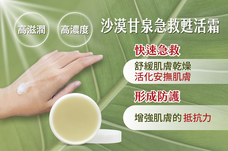 沙漠甘泉急救甦活霜,特別針對敏感肌設計,輕盈質地迅速吸收,有效舒緩乾燥敏感肌膚,恢復肌膚活力,深層保濕修護一次搞定,讓您隨時保持明亮水潤。