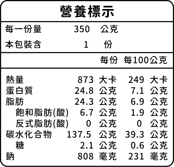 糯米、水、米酒、豬肉(台灣)、油蔥酥、麻油(芝麻)、香菇、薑、金鉤蝦、醬油膏[黃豆醬汁(水、黃豆、小麥、粗鹽)、蔗糖、糯米、甘草汁(水、甘草)、昆布汁(水、昆布)、香菇汁(水、香菇)、調味劑(5'-次黃嘌呤核苷磷酸二鈉、5'-鳥嘌呤核苷磷酸二鈉)]、大豆油、醬油、調味劑(L-麩酸鈉、鹽)、砂糖、白胡椒