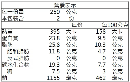 豬肉(台灣)、雞湯(水、雞骨)、洋蔥、洋蔥醬(洋蔥、紅蘿蔔、大豆油、蒜)、奶油(殺菌乳脂)、麵糊(麵粉、奶油、洋蔥)、香蕉、蕃茄糊[蕃茄泥(蕃茄糊、水)、檸檬酸]、咖哩醬[麵粉、植物油(棕櫚油、菜籽油)、焦化洋蔥(混合油脂(菜籽油、棕櫚油)、洋蔥、水)、咖哩粉(胡荽、薑黃、葫蘆巴)、食鹽、砂糖、香蕉塊、第一類普通焦糖色素、醬汁粉[糖粉、糊精(玉米)、鹽、醬汁粉(醬汁(蔬菜(番茄、洋蔥、芹菜、胡蘿蔔、蒜)、糖、鹽、香辛料(肉豆蔻、百里香、鼠尾草、芹菜))、糊精(玉米、紅薯、木薯))、洋蔥末、丁香、咖啡、辣椒、黑胡椒、肉桂、肉豆蔻、混合物(鼠尾草、玉米粉)、蘋果汁粉)]、L-麩酸鈉、薑、蒜、葡萄糖、胡椒、紅辣椒、5'-鳥嘌呤核苷磷酸二鈉、5'-次黃嘌呤核苷磷酸二鈉、DL-蘋果酸、檸檬酸、大豆蛋白水解物、醋酸鈉、醋酸、芹菜籽、香料]、蘋果、醬油、咖哩粉(胡荽、薑黃、小茴香、肉桂、眾香子、蒜、丁香、月桂葉、小豆蔻、八角)、蜂蜜、鹽、糖色(蔗糖、砂糖、水、鹽)、薑、大蒜、大豆油、雞粉[(鹽、麥芽糊精、L-麩酸鈉、糖、玉米澱粉、雞肉粉、香料、酵母萃取物(酵母萃取物、鹽)、雞油、棕櫚油、調味劑(5'-次黃嘌呤核苷磷酸二鈉、5'-鳥嘌呤核苷磷酸二鈉)、白胡椒]、巧克力(可可、糖、肉桂、薑、香草豆莢)