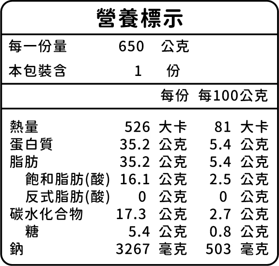 水、牛肉(美國)、蕃茄、酸白菜(白菜、高粱酒、蘋果、香蕉、鹽)、糯米醋(水、糯米)、醬油[水、大豆胺基酸液(脫脂大豆片)、食鹽、調味劑(5’–次黃嘌呤核苷磷酸二鈉、5 ’–鳥嘌呤核苷磷酸二鈉、琥珀酸二鈉)]、牛油(美國)、米酒、冰糖、鹽、調味劑(L-麩酸鈉.氯化鈉)、胡椒