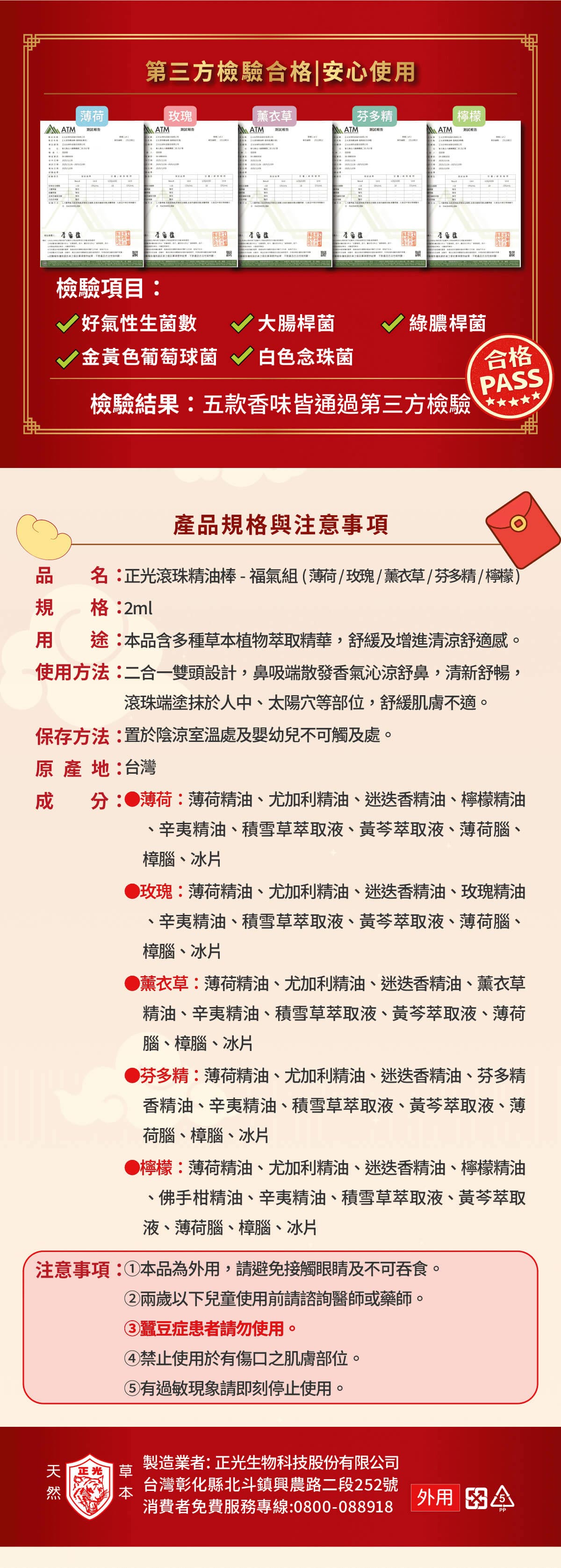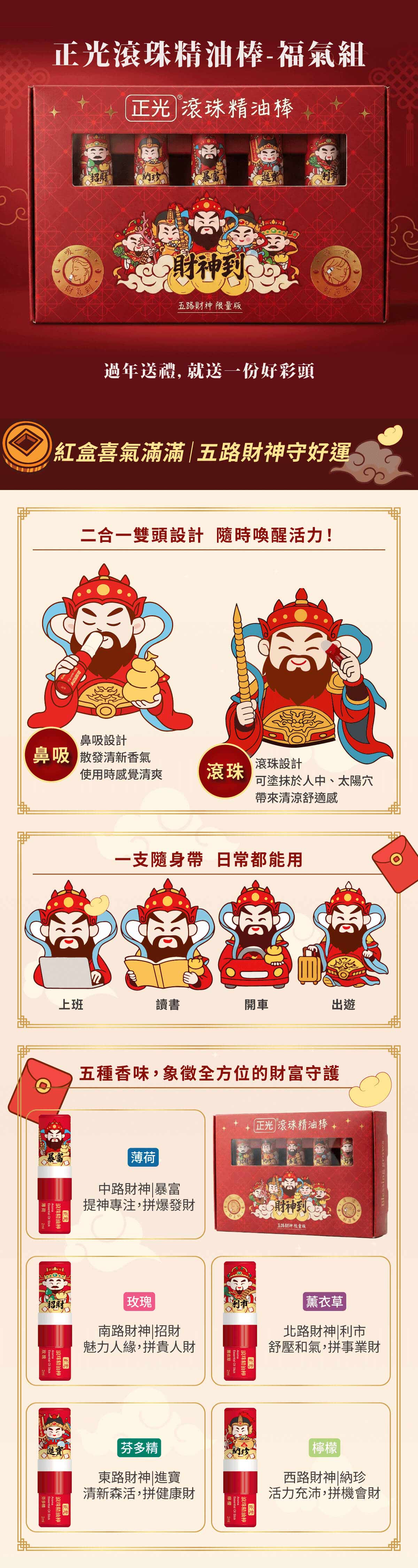 正光推出「五路財神滾珠精油棒禮盒」,將傳統信仰與現代芳療完美結合。嚴選五種草本精油,對應東、西、南、北、中五路財神,象徵全方位的財富守護。「鼻吸+滾珠」二合一設計,讓您吸一吸財氣到,滾一滾好運來!無論是職場辦公、業務拜訪、開車提神或居家放鬆,隨時隨地為身心注入滿滿正能量。紅色喜氣禮盒包裝,更是過年過節、商務贈禮的最佳首選。品名:正光滾珠精油棒-福氣組 (薄荷/玫瑰/薰衣草/芬多精/檸檬)