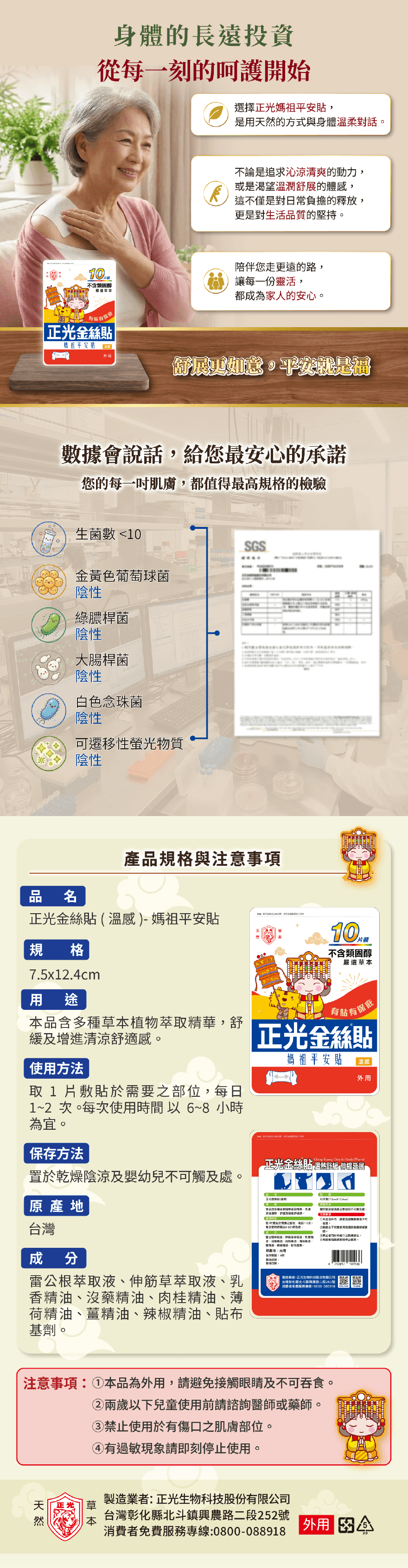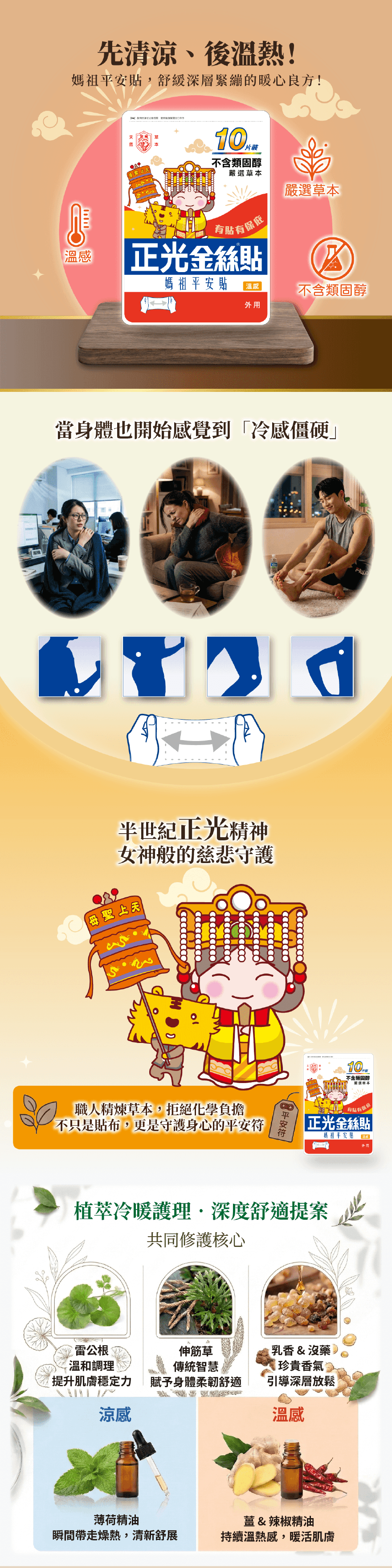 🌿 純萃草本|無西藥、無類固醇採用雷公根與伸筋草精華,溫和安撫局部緊繃,給肌膚最自然的呵護。❄️ 有感體感|先涼後溫超舒服獨特雙重體感!先清涼、後溫熱,深層釋放壓力,找回輕盈順暢感。🏃 極致服貼|超彈力親膚設計高彈力纖維,活動不脫落、不捲邊!無論怎麼動,依然穩固服貼。💼 多機適用|生活釋壓好夥伴 久坐久站: 緩解局部沉重感。 運動過後: 關鍵部位深度放鬆。 日常保養: 隨時隨地享受草本 SPA。商品名稱:正光金絲溫感感10片裝(媽祖平安貼) 產品規格:10片裝(7.5x12.4cm)產品成分:雷公根萃取液、伸筋草萃取液、乳香精油、沒藥精油、肉桂精油、薄荷精油、薑精油、辣椒精油、貼布基劑。使用方法:取1片敷貼於需要之部位,每日1~2次。 每次使用時間 以6~8小時為宜。保存方法:避免陽光直射,儲存於陰涼室溫處。保存期限:4年原產地:台灣注意事項:①本品為外用,請避免接觸眼睛及不可吞食。②兩歲以下兒童使用前請諮詢醫師或藥師。③禁止使用於有傷口之肌膚部位。④有過敏現象請即刻停止使用。製造業者:正光生物科技股份有限公司電話:0800-088-918地址:彰化縣北斗鎮興農路二段252號