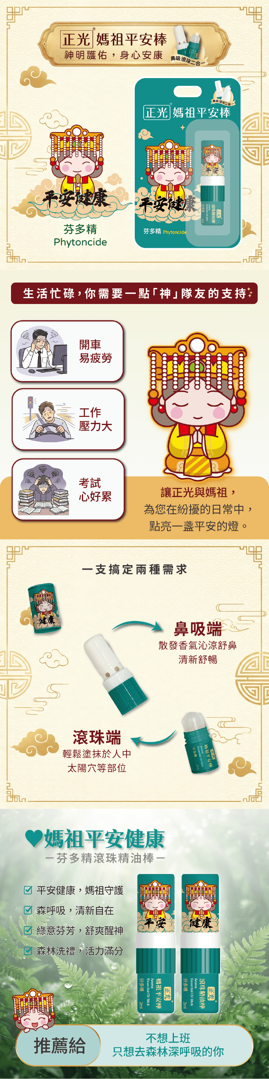 🌲 平安健康.最深祝福:「平安健康」,祈求媽祖守護身心安康、百病不侵,是送給親友最貼心的禮物。🍃 森林綠意.沉穩安寧:採用深沈有質感的森林綠配色,象徵大自然的生命力與修復力。🌳 芬多精香.自然洗禮:內含芬多精香精油、薄荷與迷迭香,氣味如同森林浴般清新,幫助淨化呼吸、放鬆身心。✨ 鼻吸滾珠.雙效合一: 吸一口:享受如森林般的純淨空氣,舒暢呼吸。 滾一下:清涼舒緩,趕走身體的疲憊與不適。【平安健康版】健康是最大的財富,讓媽祖為您守護!如果說「平安富貴」是追求外在的成就,那麼這款「平安健康」就是回歸內在的根本。深綠色的包裝象徵著森林的生機,搭配媽祖的慈悲守護,祈願每一位使用者都能身體健康、平平安安。把「森林」隨身帶著走: 在這個充滿壓力的水泥叢林中,您需要一點大自然的氣息。森呼吸: 轉開前端鼻吸,獨特芬多精香氣撲鼻而來,彷彿瞬間移動到阿里山林間,大口呼吸最純淨的空氣。舒緩疲勞: 轉開後端滾珠,輕輕按摩,讓積雪草與黃芩萃取液 舒緩肌膚,釋放緊繃感。這不僅僅是一支精油棒,更是一張隨身的「健康平安符」。商品名稱:正光媽祖平安棒-芬多精(平安健康)產品規格:2ml用途:本品含多種草本植物萃取精華,舒緩及增進清涼舒適感。產品成分:薄荷精油、尤加利精油、迷迭香精油、芬多精香精油、辛夷精油、積雪草萃取液、黃芩萃取液、薄荷腦、樟腦、冰片。使用方法:二合一雙頭設計,鼻吸端散發香氣沁涼舒鼻,清新舒暢,滾珠端塗抹於人中、太陽穴等部位,舒緩肌膚不適。保存方法:置於陰涼室溫處及嬰幼兒不可觸及處。保存期限:3年原產地:台灣注意事項:①本品為外用,請避免接觸眼睛及不可吞食。②兩歲以下兒童使用前請諮詢醫師或藥師。③蠶豆症患者請勿使用。④禁止使用於有傷口之肌膚部位。⑤ 有過敏現象請即刻停止使用。製造業者:正光生物科技股份有限公司電話:0800-088-918 地址:彰化縣北斗鎮興農路二段252號本產品屬個人衛生用品,依法令規定,經拆封(如:撕除封膜、開蓋、使用)後,恕不接受退貨。 購買前請先確認需求。