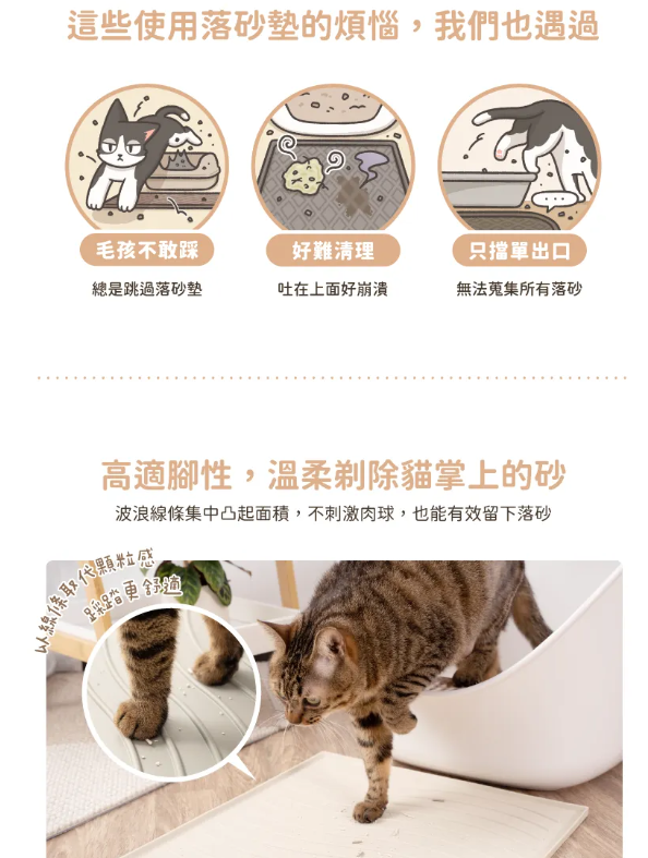 完整圍繞,一粒砂也不放過!• 圓弧波浪線條,高適腳性、溫柔剔除貓掌砂• 單層設計+防水矽膠,清潔快速簡便• 自由拼接,可完整圍繞各式砂盆出口• 圓弧波浪線條,高適腳性、溫柔剔除貓掌砂• 單層設計+防水矽膠,清潔快速簡便• 自由拼接,可完整圍繞各式砂盆出口• 單束設計+細軟毛,不刺激毛孩牙齦• 日本製與台灣製,品質保證• 開放大空間,符合貓咪天性,如廁不壓迫• 38cm高牆,防止貓砂、尿液外噴• 一體成形,好清潔、不易藏污納垢