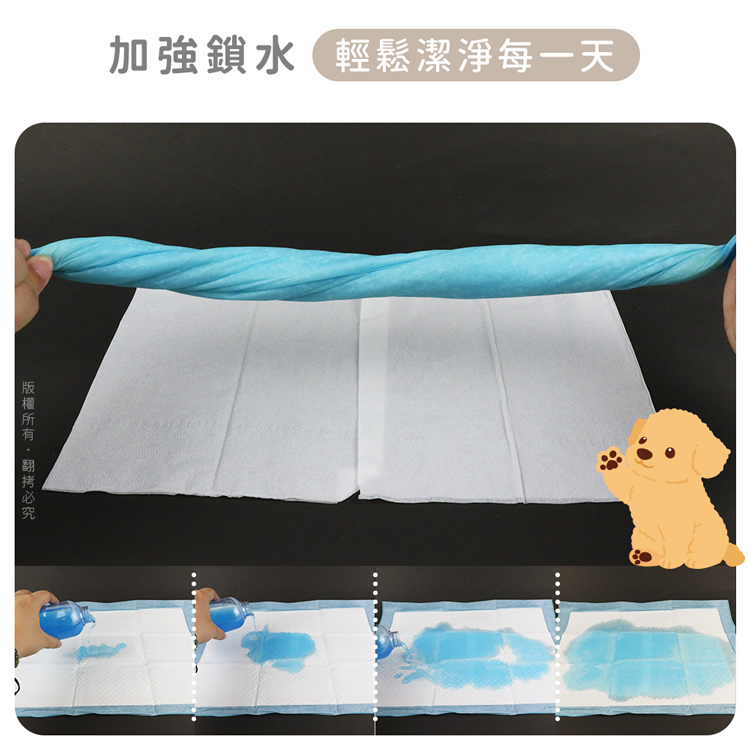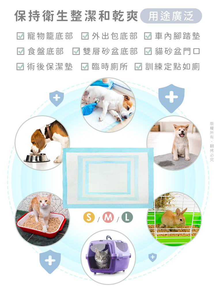 汪本屋 實用經濟款 寵物尿布墊(S號/M號/L號)-6包 --六層鎖水技術,加倍鎖水乾爽無異味----無添加色素香料,狗/貓/鼠/兔…等皆適用-- 專為毛孩所設計的衛生用品,如海綿般吸水,尿液迅速導流,輕鬆潔淨每一天,強效鎖水防止尿液側漏,保持整潔乾淨 用途廣泛,除了可放於寵物籠底部,或雙層貓砂盆下層吸水之外,如果需要帶寵物外出時,也可置於寵物推車、外出籠、外出包…等擺放尿布墊於底部,可保持空間整潔! 六層鎖水技術,上層親膚不織布,給毛孩柔軟呵護,網格壓紋設計,搭配雙層吸水紙,水分迅速導流高分子吸水顆粒,瞬吸自身體積數倍重量水分,加倍鎖水絨毛漿層瞬間吸收,有效防止回滲,底部PE防水膜徹底杜絕液體滲漏! S號(33x45cm):幼犬/倉鼠籠/兔籠/外出包…等M號(45x60cm):中型犬/貓砂盆門口/雙層貓砂盆底層…等L號(60x90cm):大型犬/術後保潔墊/汽車踏墊…等 <圖> 使用方式: 1.購買前,請先選擇適合寵物體型與擺放場所的尺寸 S號(33x45cm):幼犬/小型犬/倉鼠籠/兔籠/外出包…等 M號(45x60cm):中型犬/貓砂盆門口/雙層砂盆底層…等 L號(60x90cm):大型犬/術後保潔墊/汽車踏墊…等2.打開包裝後取出尿布墊,將不織布面朝上擺放。3.平鋪在平坦面或是寵物籠尿盆上即可開始使用。 如何訓練定點如廁: 1.請選擇能讓寵物安心及安撫的地點與空間,如廁所、寵物籠…等 在地點決定後,請勿隨意更換地點,免以造成寵物認知誤差!2.初始訓練時,當狗狗有想大/小便的徵兆時(到處嗅、轉圈圈、臂部蹲低…), 請立刻帶寵物至尿布墊擺放的場所。3.再訓練的過程中,請飼主給與耐心/讚美/獎勵,重覆動作是教育很重要的一環。 切勿以處罰的方式來進行訓練,否則可能造成寵物身、心受傷。4.狗狗上過幾次後,之後就會習慣去尿布墊上尿尿。5.在訓練過程中寵物如果至錯誤的地點大/小便,請確實清掃乾淨,切勿留下臭味。6.可搭配圍籬、誘導劑、禁區噴霧…等,幫助訓練過程順利。 注意事項: .本產品僅供寵物使用。.本商品為接觸型商品,為避免傳染性疾病(如:跳蚤/壁虱/疥癬…等) 一經開封或試用過,恕不受理更換事宜。.若尿布墊已被寵物拉扯斷裂時,請立即終止使用。.使用時請將不織布面朝上做用。.請勿將尿布墊丟入馬桶中,這將會導致排水管的堵塞。.購買前仔細詳閱商品規格尺寸,慎重購買,以免造成日後買賣糾紛。.尺寸與重量皆採手工測量,±5%誤差屬正常範圍。 轉載警示: 自民國108年6月1日起(含追溯既往),鈞嵐(立嵐)企業有限公司之 商品圖片、影片或鈞嵐(立嵐)企業有限公司文字及LOGO, 任何客戶或用戶需轉載刊登任何圖片、文字、影片 皆需經過鈞嵐(立嵐)書面同意,如有需求請與鈞嵐(立嵐)客服中心接洽聯絡。 若任何未經鈞嵐(立嵐)同意即任意轉載刊登者, 我司將進行相關智慧財產著作權與商標權及商業法的追訴權利。 商品規格: .型 號:OO-P-PPA-BOX.品 名:汪本屋 實用經濟款 寵物尿布墊.規 格:S號 33x45cm/片;M號 45x60cm/片;L號 60x90cm/片.單包入數:S號 100片/包;M號 50片/包;L號 25片/包.重 量:約 1200 g ±5% (單包).材 質:親膚不織布、吸水紙(上下層)、高分子吸水顆粒、絨毛漿、PE防漏膜.包裝內含:S號 100片/包,共6包 M號 50片/包,共6包 L號 25片/包,共6包.商品保固:僅限新品瑕疪更可換商品