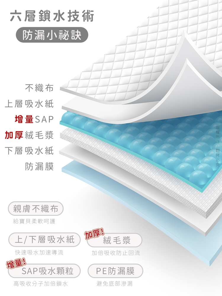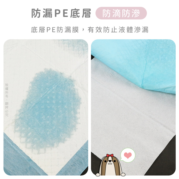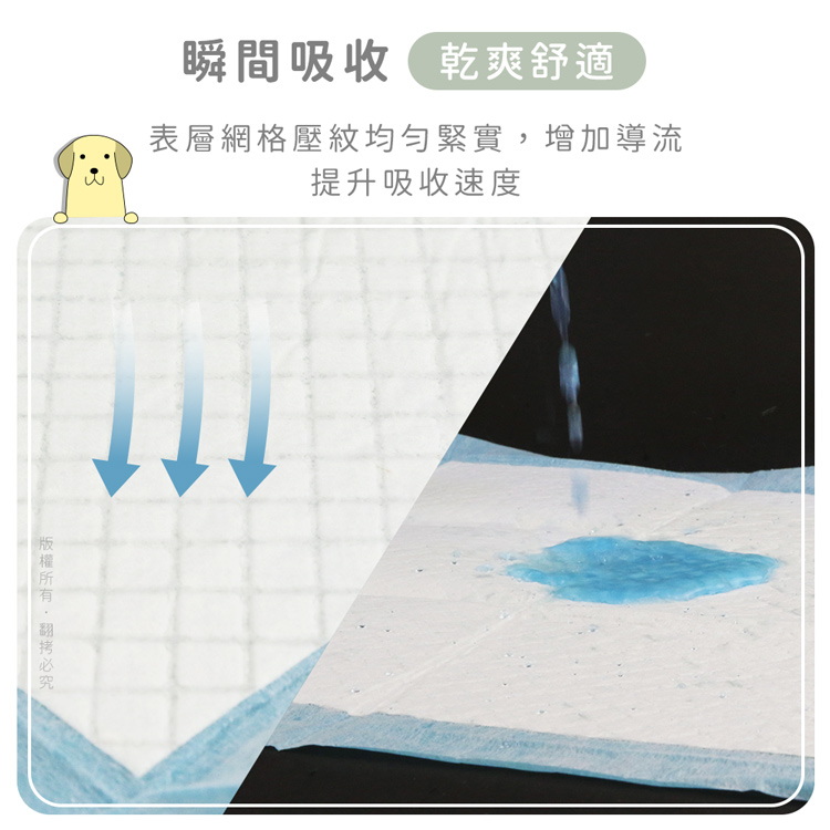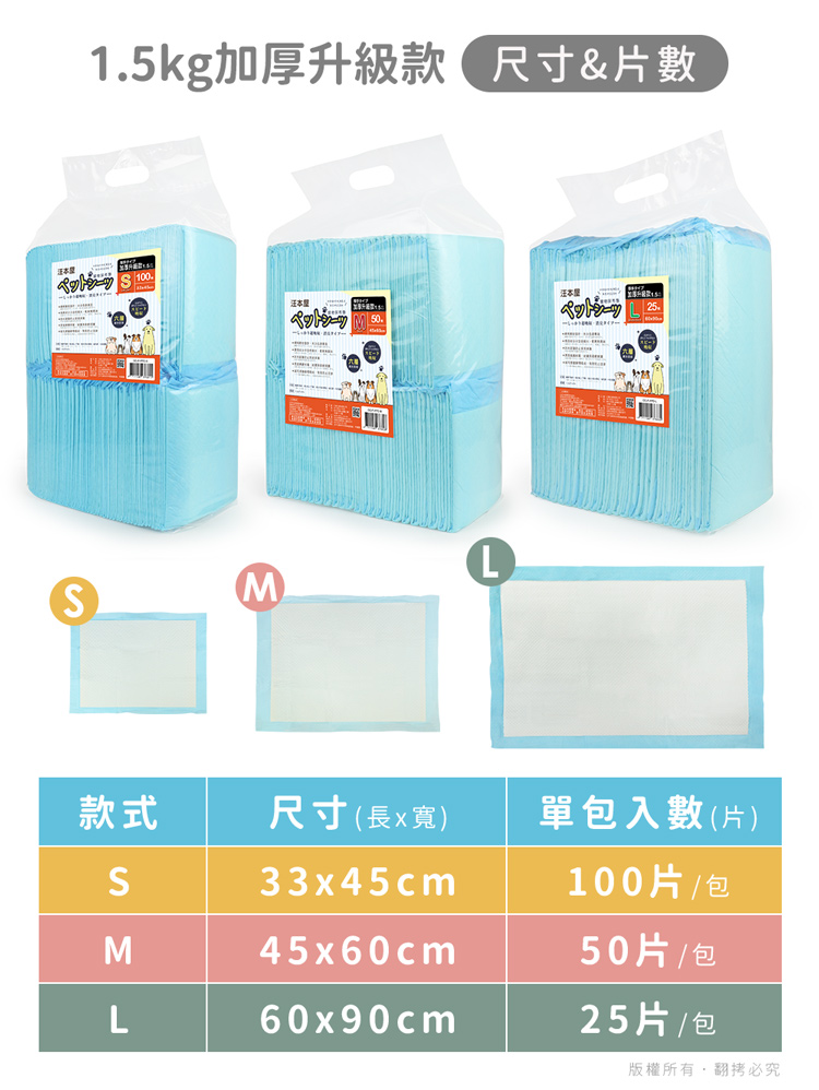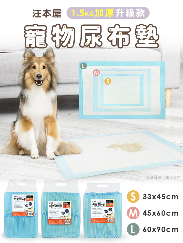 汪本屋 1.5kg加厚升級款 寵物尿布墊(S號/M號/L號)-6包 --六層鎖水技術,加厚升級款加倍鎖水乾爽無異味----無添加色素香料,狗/貓/鼠/兔…等皆適用-- 專為毛孩所設計的衛生用品,如海綿般吸水,尿液迅速導流,輕鬆潔淨每一天,強效鎖水防止尿液側漏,保持整潔乾淨 用途廣泛,除了可放於寵物籠底部,或雙層貓砂盆下層吸水之外,如果需要帶寵物外出時,也可置於寵物推車、外出籠、外出包…等擺放尿布墊於底部,可保持空間整潔! 六層鎖水技術,上層親膚不織布,給毛孩柔軟呵護,網格壓紋設計,搭配雙層吸水紙,水分迅速導流【增量】高分子吸水顆粒,瞬吸自身體積數倍重量水分,加倍鎖水【加厚】絨毛漿層瞬間吸收,有效防止回滲,底部PE防水膜徹底杜絕液體滲漏! S號(33x45cm):幼犬/倉鼠籠/兔籠/外出包…等M號(45x60cm):中型犬/貓砂盆門口/雙層貓砂盆底層…等L號(60x90cm):大型犬/術後保潔墊/汽車踏墊…等