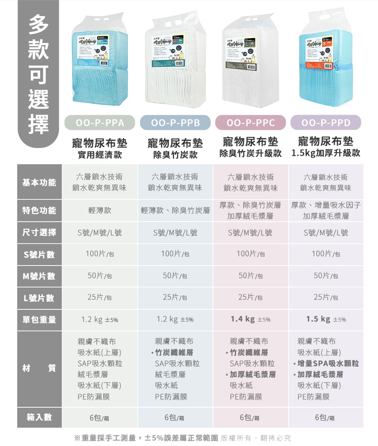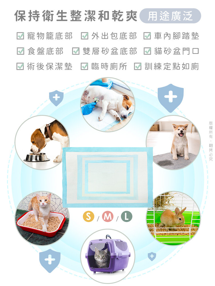 使用方式: 1.購買前,請先選擇適合寵物體型與擺放場所的尺寸 S號(33x45cm):幼犬/小型犬/倉鼠籠/兔籠/外出包…等 M號(45x60cm):中型犬/貓砂盆門口/雙層砂盆底層…等 L號(60x90cm):大型犬/術後保潔墊/汽車踏墊…等2.打開包裝後取出尿布墊,將不織布面朝上擺放。3.平鋪在平坦面或是寵物籠尿盆上即可開始使用。 如何訓練定點如廁: 1.請選擇能讓寵物安心及安撫的地點與空間,如廁所、寵物籠…等 在地點決定後,請勿隨意更換地點,免以造成寵物認知誤差!2.初始訓練時,當狗狗有想大/小便的徵兆時(到處嗅、轉圈圈、臂部蹲低…), 請立刻帶寵物至尿布墊擺放的場所。3.再訓練的過程中,請飼主給與耐心/讚美/獎勵,重覆動作是教育很重要的一環。 切勿以處罰的方式來進行訓練,否則可能造成寵物身、心受傷。4.狗狗上過幾次後,之後就會習慣去尿布墊上尿尿。5.在訓練過程中寵物如果至錯誤的地點大/小便,請確實清掃乾淨,切勿留下臭味。6.可搭配圍籬、誘導劑、禁區噴霧…等,幫助訓練過程順利。 注意事項: .本產品僅供寵物使用。.本商品為接觸型商品,為避免傳染性疾病(如:跳蚤/壁虱/疥癬…等) 一經開封或試用過,恕不受理更換事宜。.若尿布墊已被寵物拉扯斷裂時,請立即終止使用。.使用時請將不織布面朝上做用。.請勿將尿布墊丟入馬桶中,這將會導致排水管的堵塞。.購買前仔細詳閱商品規格尺寸,慎重購買,以免造成日後買賣糾紛。.尺寸與重量皆採手工測量,±5%誤差屬正常範圍。 轉載警示: 自民國108年6月1日起(含追溯既往),鈞嵐(立嵐)企業有限公司之 商品圖片、影片或鈞嵐(立嵐)企業有限公司文字及LOGO, 任何客戶或用戶需轉載刊登任何圖片、文字、影片 皆需經過鈞嵐(立嵐)書面同意,如有需求請與鈞嵐(立嵐)客服中心接洽聯絡。 若任何未經鈞嵐(立嵐)同意即任意轉載刊登者, 我司將進行相關智慧財產著作權與商標權及商業法的追訴權利。 商品規格: .型 號:OO-P-PPD-BOX.品 名:汪本屋 1.5kg加厚升級款 寵物尿布墊.規 格:S號 33x45cm/片;M號 45x60cm/片;L號 60x90cm/片.單包入數:S號 100片/包;M號 50片/包;L號 25片/包.重 量:約 1500 g ±5% (單包).材 質:親膚不織布、吸水紙(上下層)、高分子吸水顆粒、絨毛漿、PE防漏膜.包裝內含:S號 100片/包,共6包 M號 50片/包,共6包 L號 25片/包,共6包.商品保固:僅限新品瑕疪更可換商品