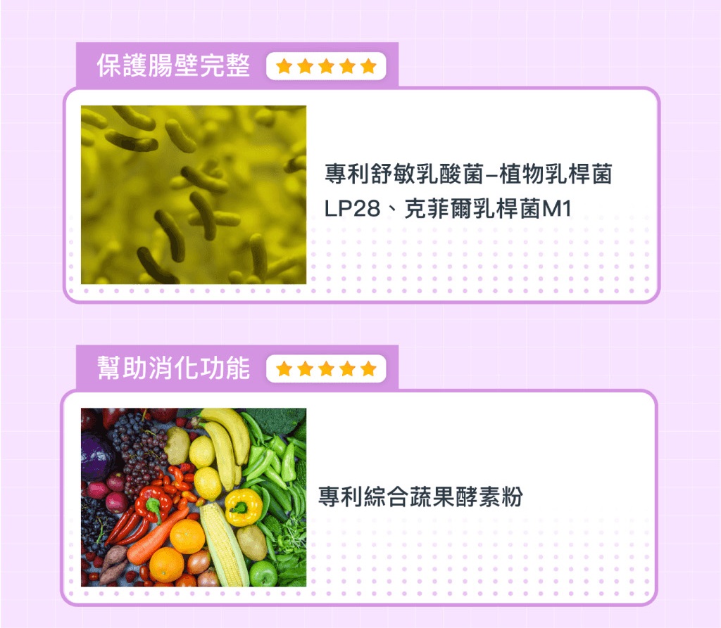 CinterPlex®綜合維生素(含鐵)、Cinteral®專利微胜肽、植物乳桿菌LP28、克菲爾乳桿菌M1、專利綜合蔬果酵素、菊糖、深海魚粉