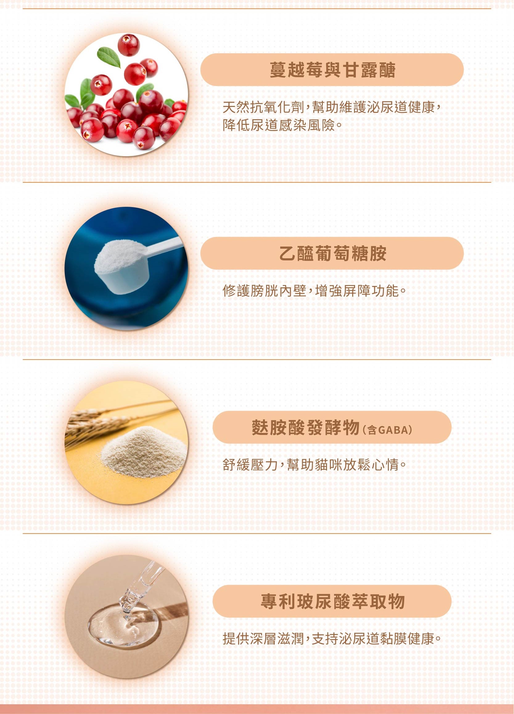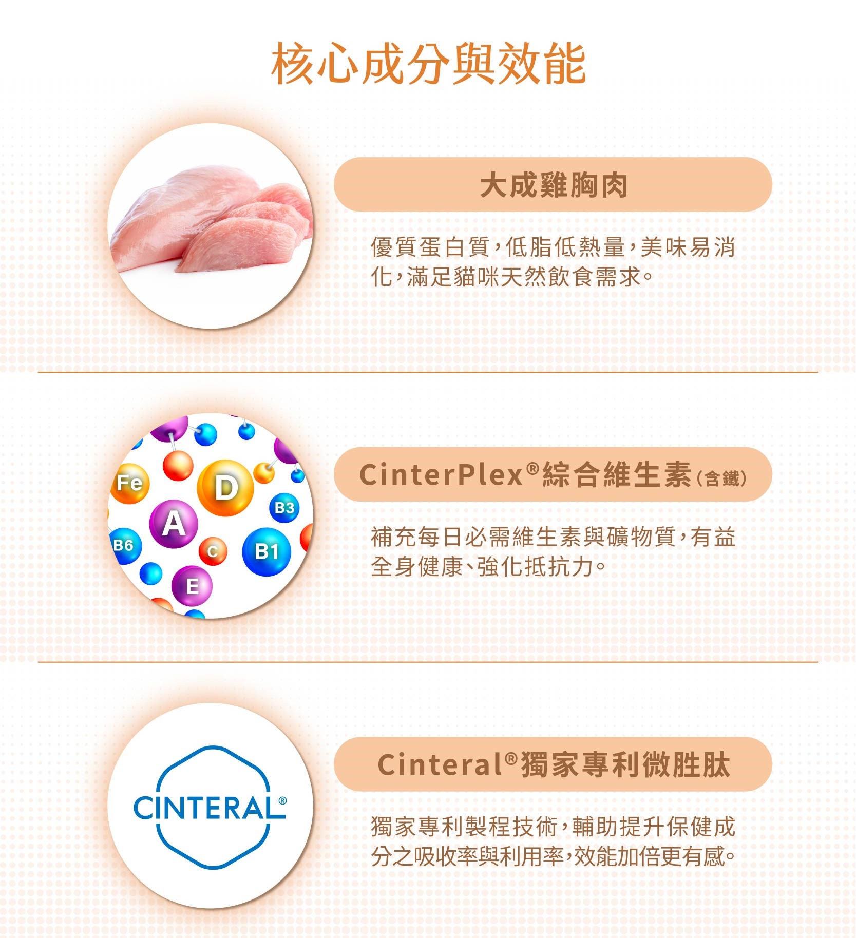 雞肉、CinterPlex®綜合維生素(含鐵)、Cinteral®專利微胜肽、蔓越莓、甘露醣、乙醯葡萄糖胺、麩胺酸發酵物(含GABA)、專利玻尿酸萃取物