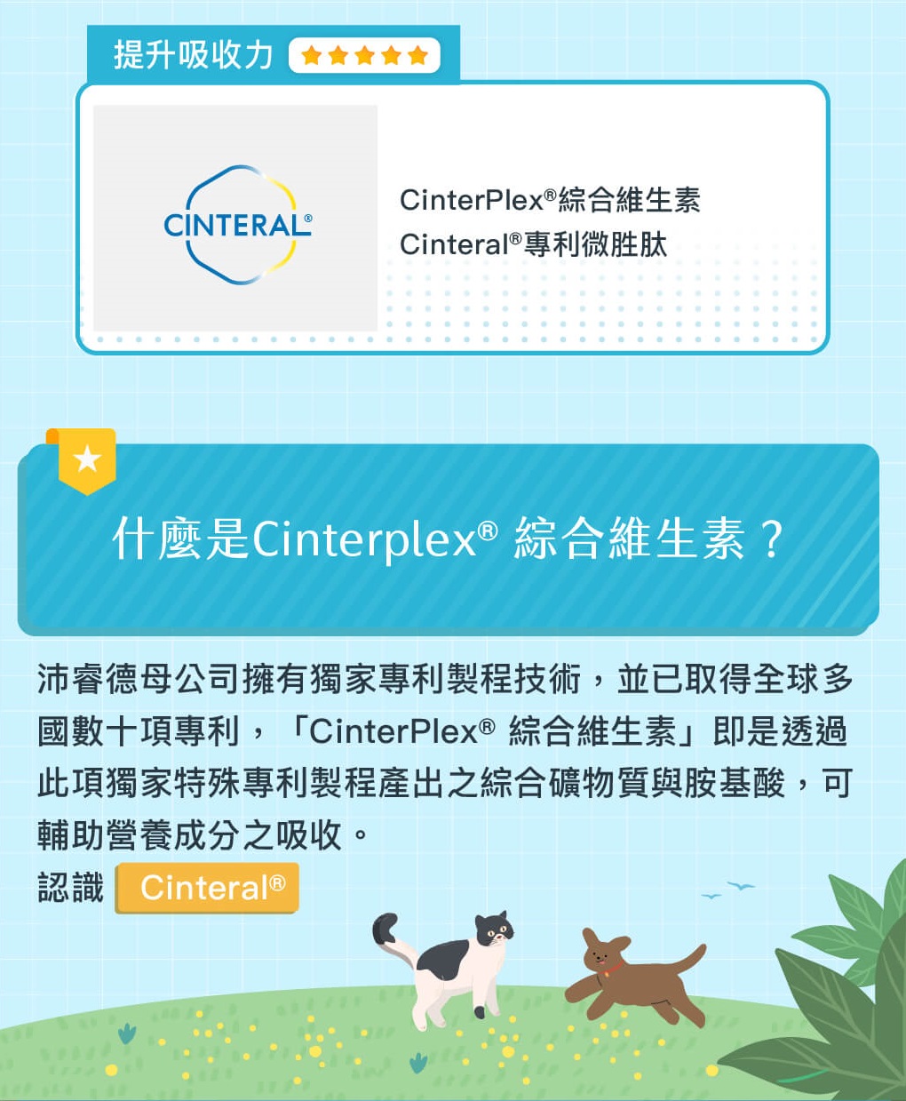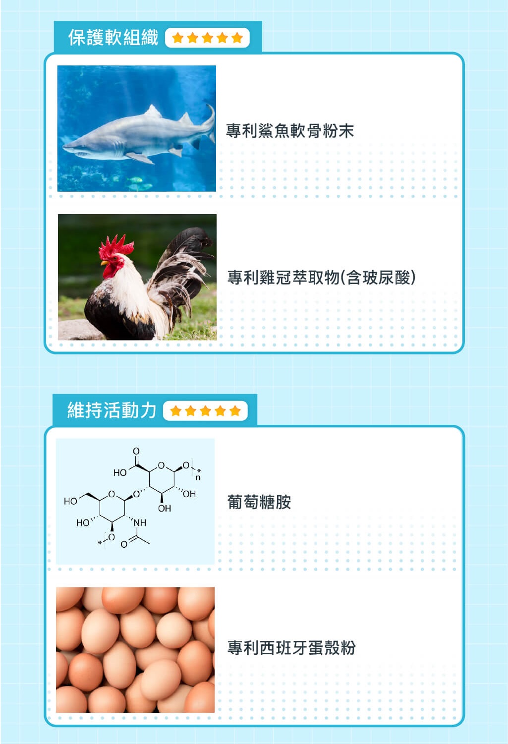 CinterPlex®綜合維生素(含鐵)、Cinteral®專利微胜肽、西班牙專利蛋殼膜水解萃取、綠唇貽貝粉、專利鯊魚軟骨素、葡萄糖胺、專利天然玻尿酸萃取、深海魚粉
