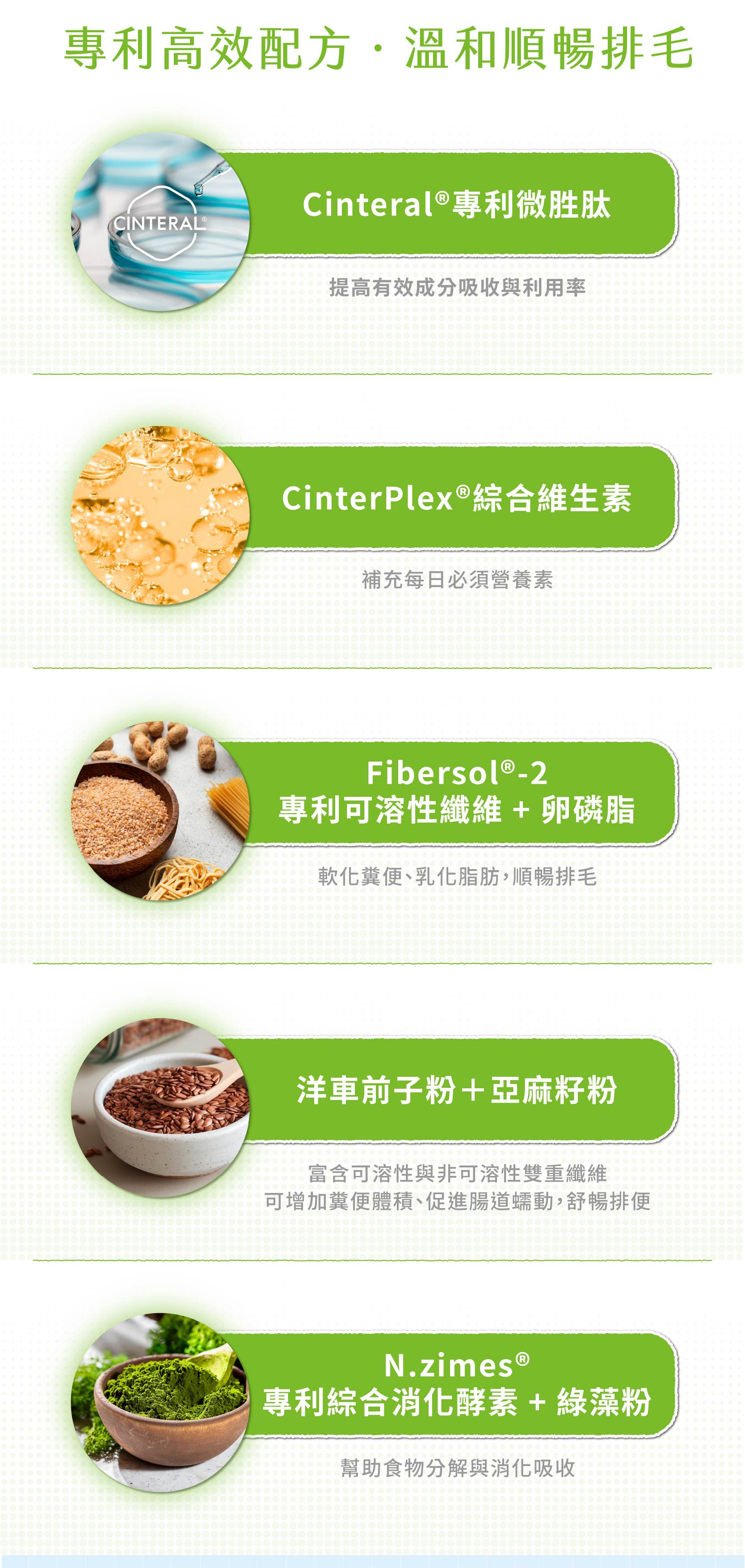 CinterPlex®綜合維生素、Cinteral®專利微胜肽、洋車前子粉、N.zimes® 專利基礎綜合消化酵素、Fibersol®-2專利可溶性纖維、卵磷脂粉、綠藻粉、亞麻籽粉