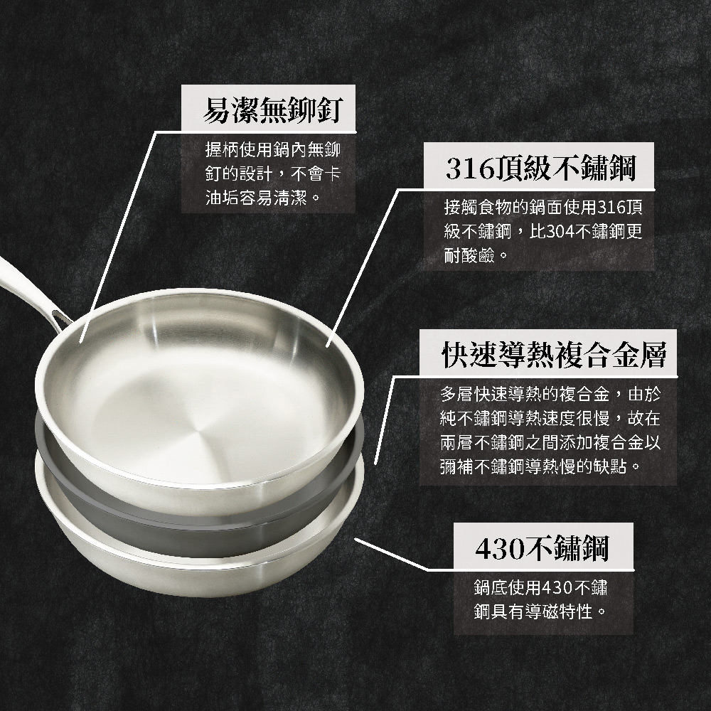 ◆鍋身材質:內層採用316不鏽鋼,外層採用430導磁性不鏽鋼。