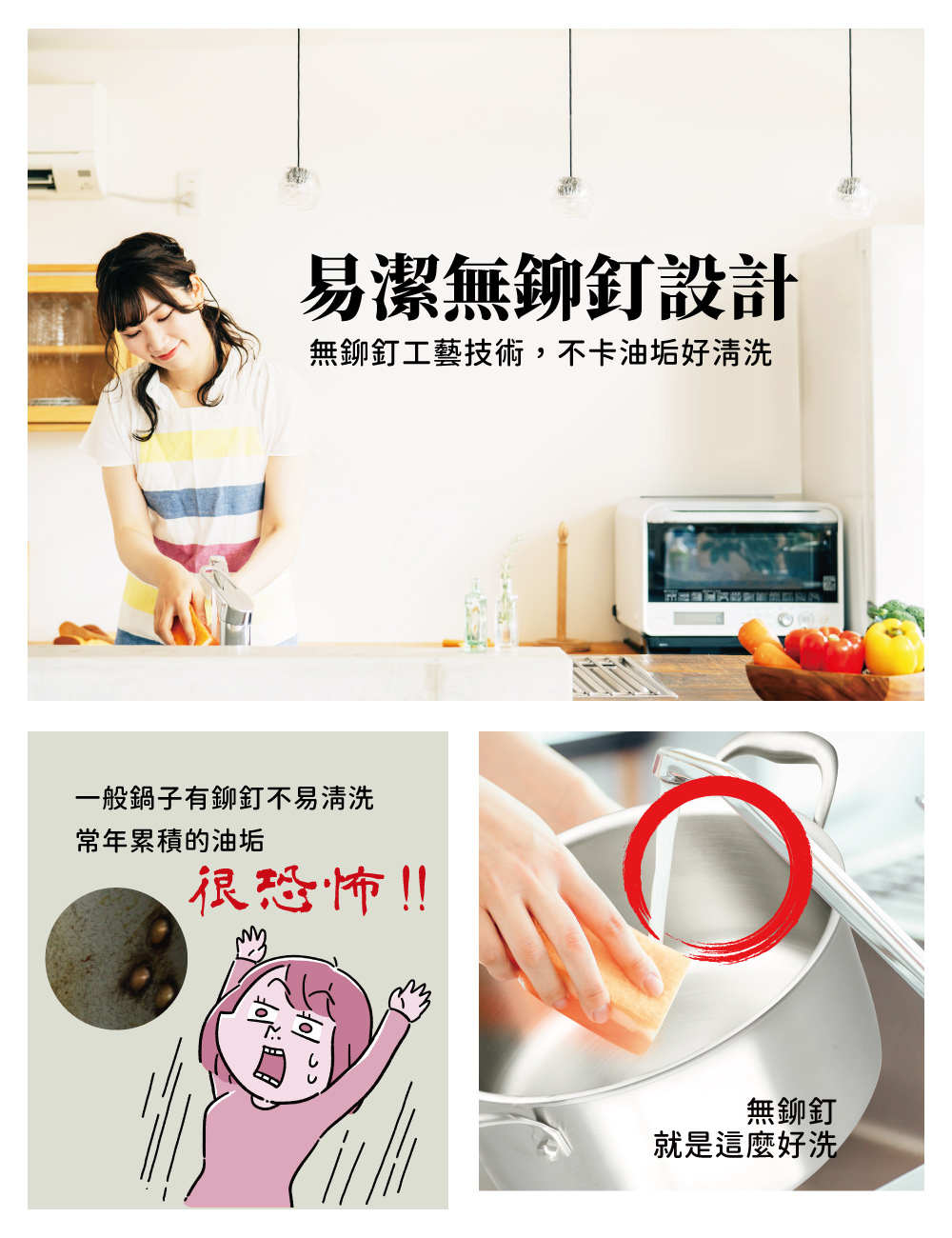 ※鍋內無鉚釘設計,不卡油垢好清洗,不再怕煮菜連油垢一起煮。