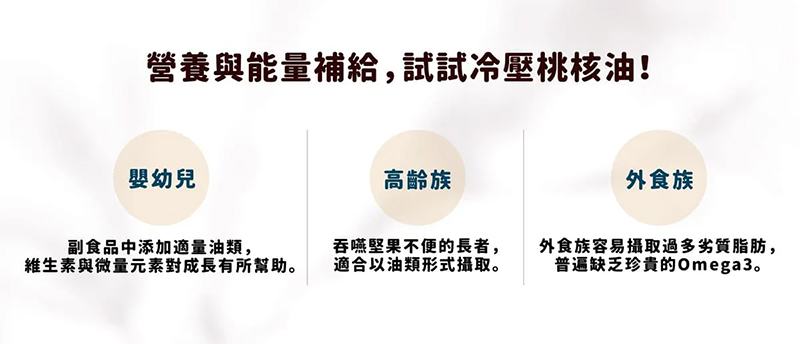 . 100%核桃冷壓初榨,厚工耗時精華淬煉. 榨油全程控制30度內,保留全部營養. 含90%不飽和脂肪酸,比橄欖油更高. 使用560公克核桃才能提煉250毫升核桃油. 零添加、富含維生素E、Omega-3(14%). 與台灣在地HACCP高規油廠共同開發