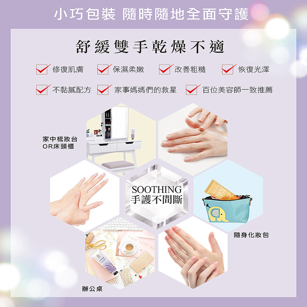 ★舒緩雙手乾燥不適 手護不間斷★修護手部肌膚 隨時隨地全面呵護★保濕柔嫩 不黏膩配方★改善粗糙 恢復光澤★燕麥萃取 幫助肌膚舒緩乾燥不適問題