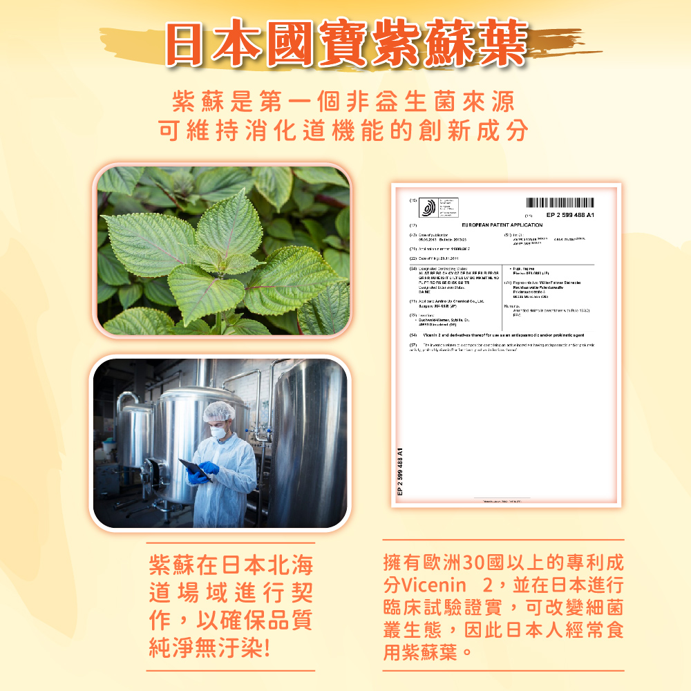 🔹日本國寶紫蘇葉:紫蘇是第一個非益生菌來源,可維持消化道機能的創新成分,擁有歐洲30國以上的專利成-Vicenin 2,並在日本進行臨床試驗證實,可改變細菌叢生態。 🔹專利共生15益菌:專利包埋結構技術,保護菌種順利定殖腸道,發揮最大功效。 🔹木瓜酵素及鳳梨酵素:幫助消化與促進新陳代謝,加速體內環保。 🔹適用族群:久坐不動、經常外食、排便不順、蔬果攝取不足。 🔹奶素 o 經期 o 備孕 o 哺乳 o 孕期 o 建議年齡 4歲以上