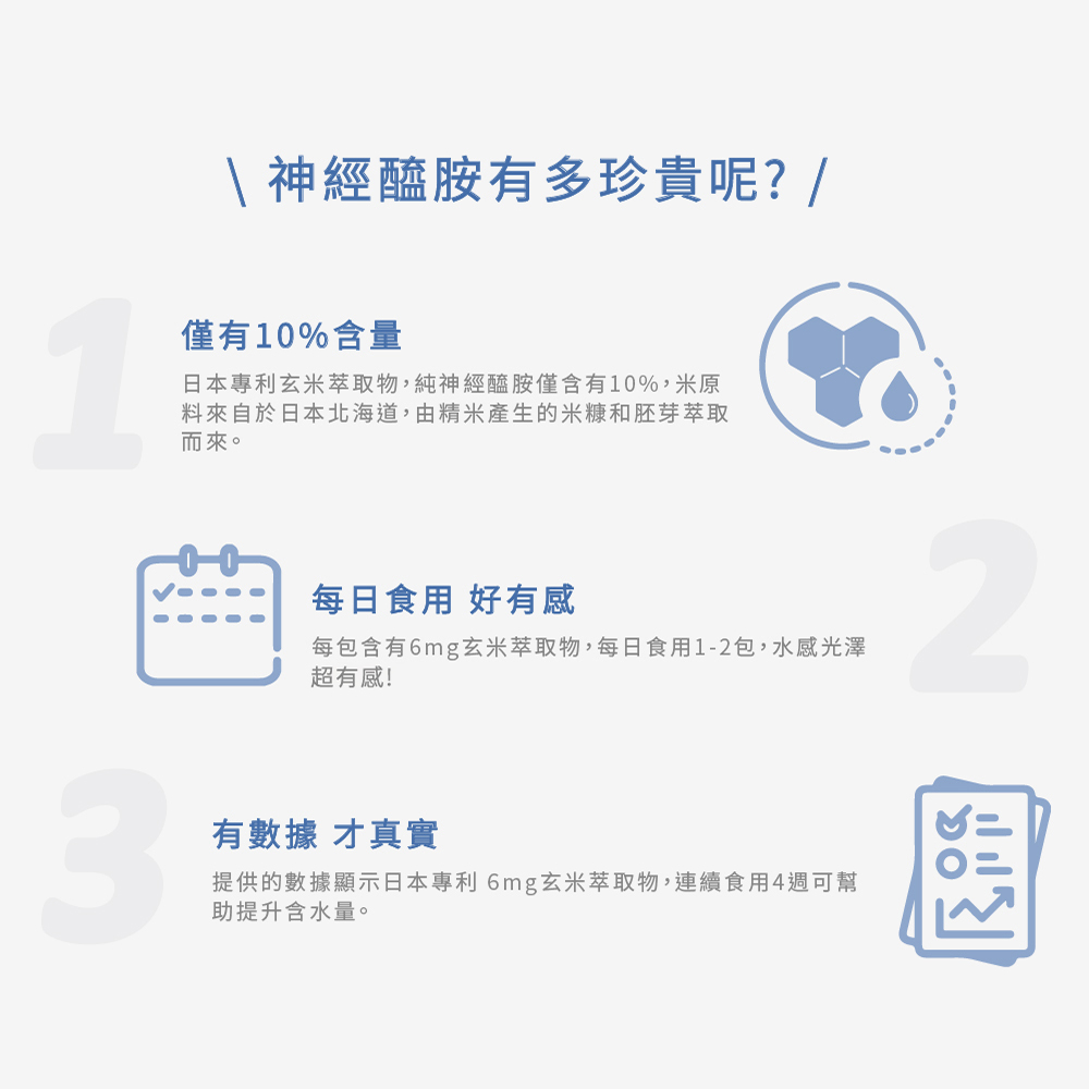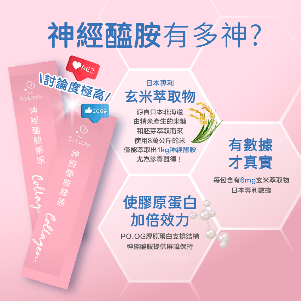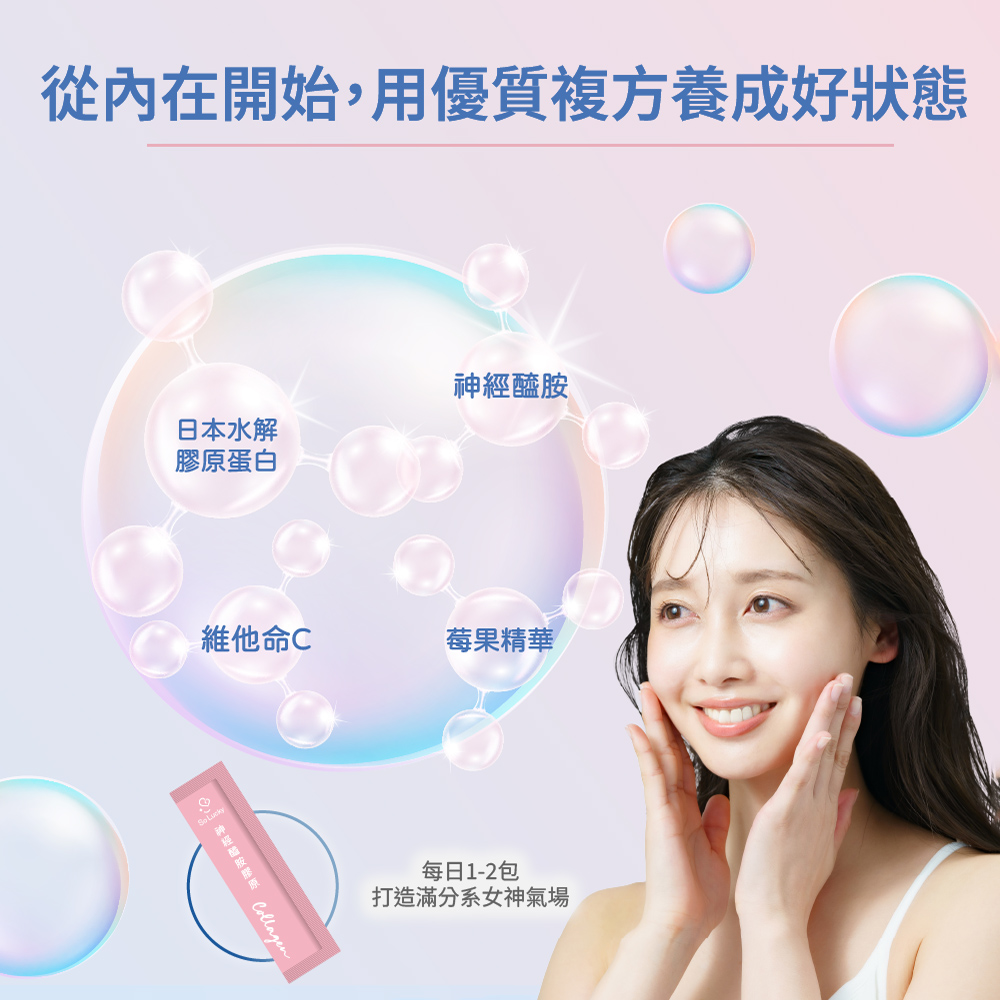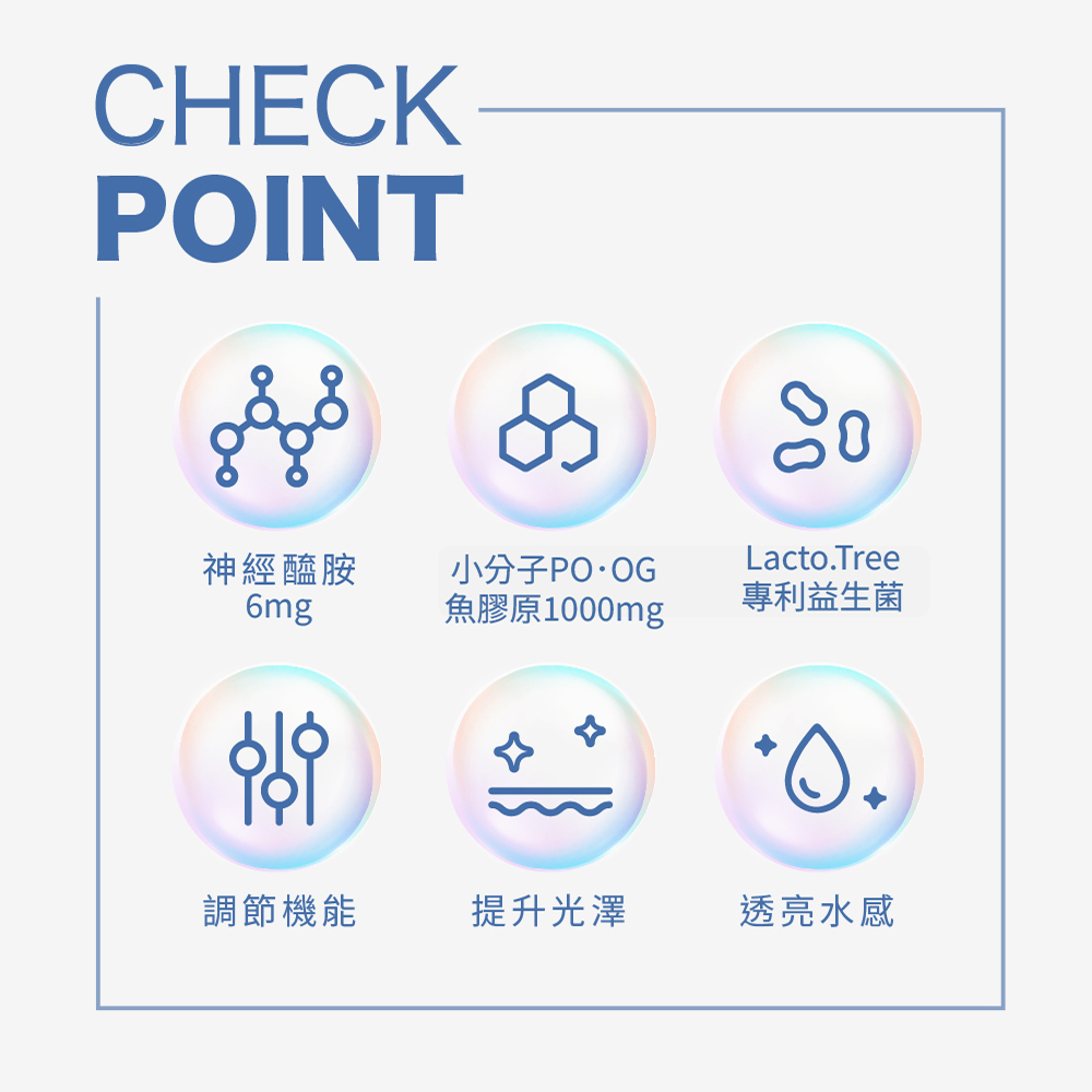 ▶ 透感水亮光澤的秘密:日本專利玄米萃取物(含神經醯胺),每包含有6mg,每日食用1包,連續食用4週可提升角質層含水量,讓你輕鬆擁有水感好氣色! ▶ 專為美麗設計的獨家專利益生菌:大葉山芙蓉草本複合益生菌,由漢方草本與益生菌結合,幫助調節體質,為美麗加分。 ▶ 日本專利PO·OG全魚膠原:由日本大廠專利雙胜肽PO·OG魚膠原,雙胜肽分子小好吸收。 ▶ 七種莓果多酚萃取:萃取天然莓果多酚,富含花青素與多種維生素,維持美妍好氣色。 ▶ 穀胱甘肽:隨著年齡增長,體內穀胱甘肽合成率下降,定期補充讓妳擁有美麗蘋果光。