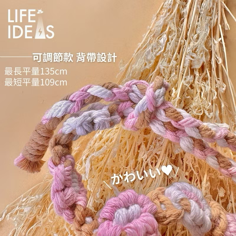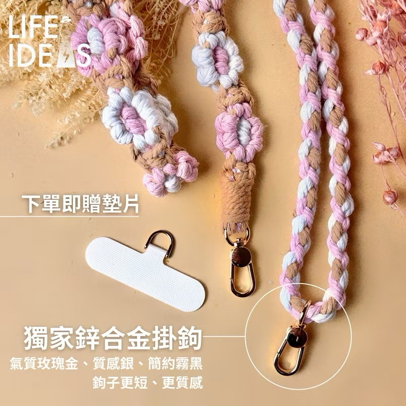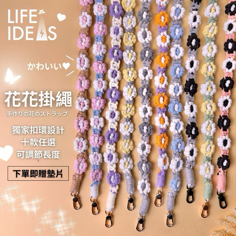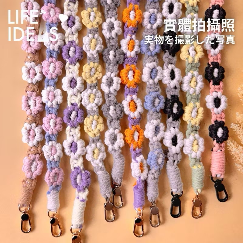 一律採用棉繩材質,才能久戴舒適透氣,不刺肌膚。編織:手工編織,使花花掛繩更有立體感。扣環:採用鋅合金,質感俏麗,不會生鏽!長款:可調節款 長度109-135cm。適用:身高140-180的姐妹都適用唷。調節款:斜背、側背、前背都適用呦!