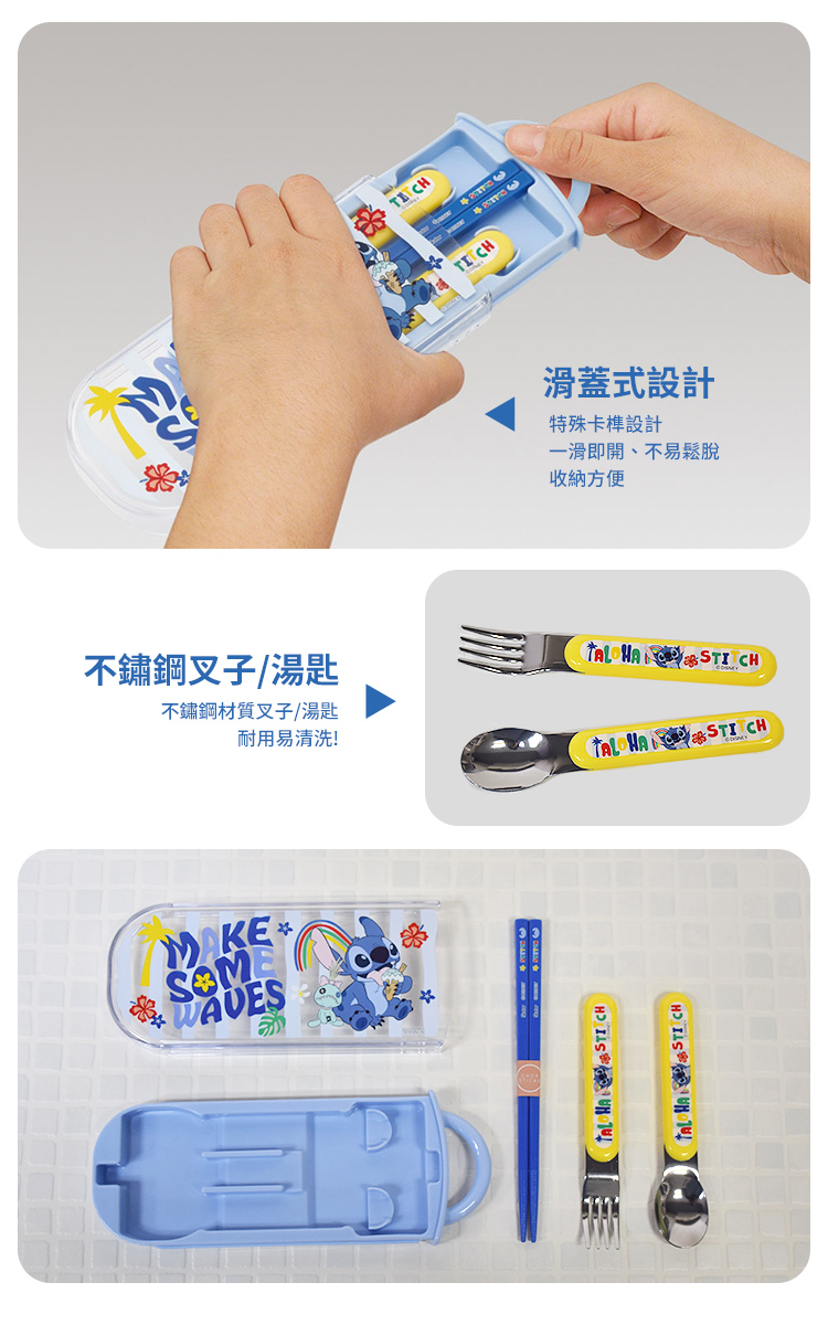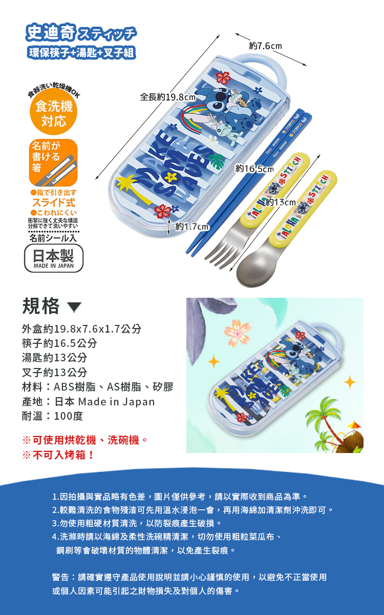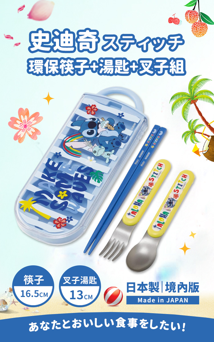 【百科良品】日本製 迪士尼 史迪奇 夏日搖擺 環保筷子+湯匙+叉子三件餐具組(日本境內版)