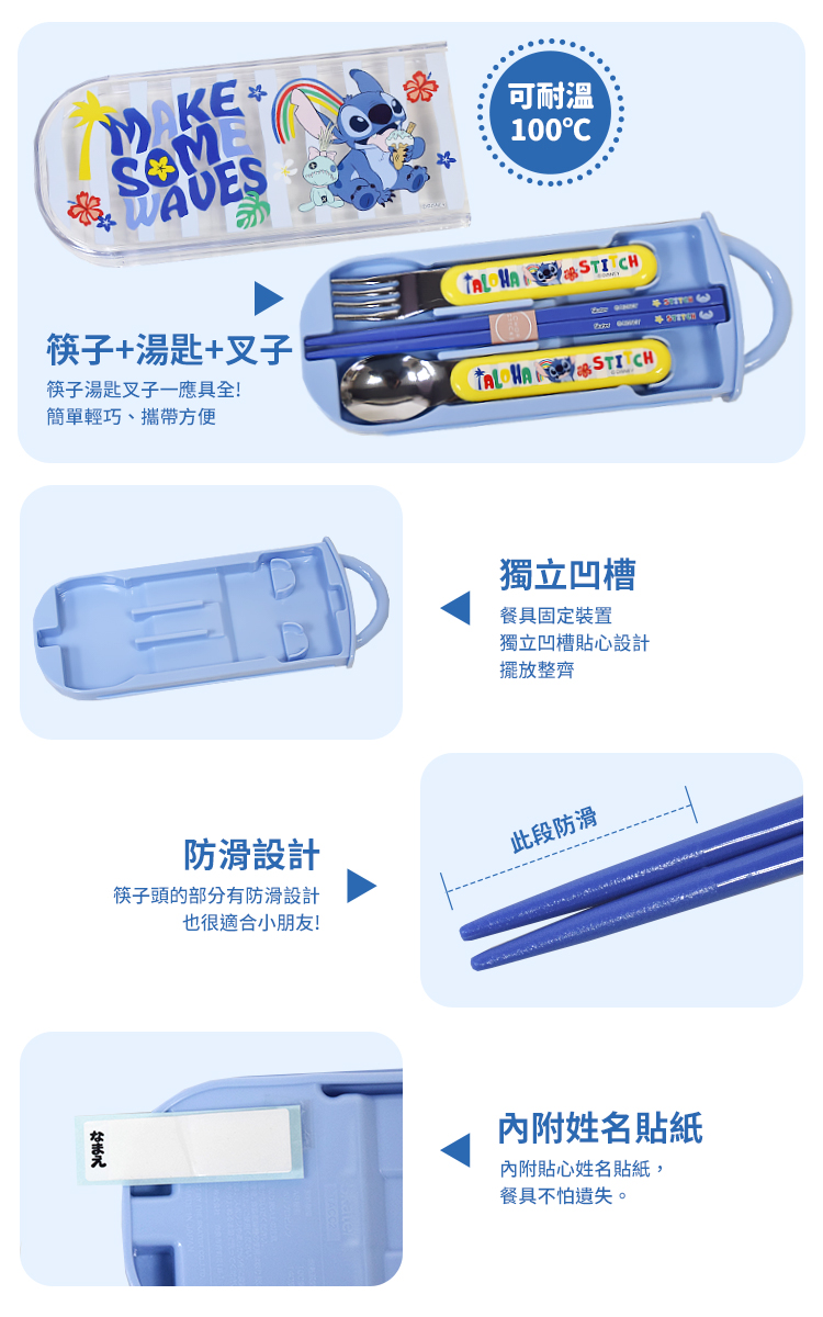 ●筷子湯匙叉子 一應具全●內附姓名貼紙,不怕遺失餐具●滑蓋式設計,收納方便,簡約輕巧●筷子頭的部分有防滑設計,方便夾取食物!