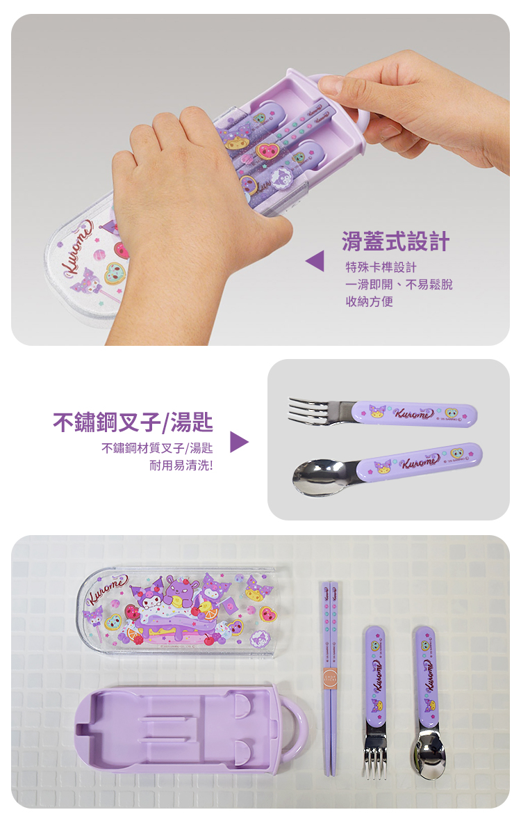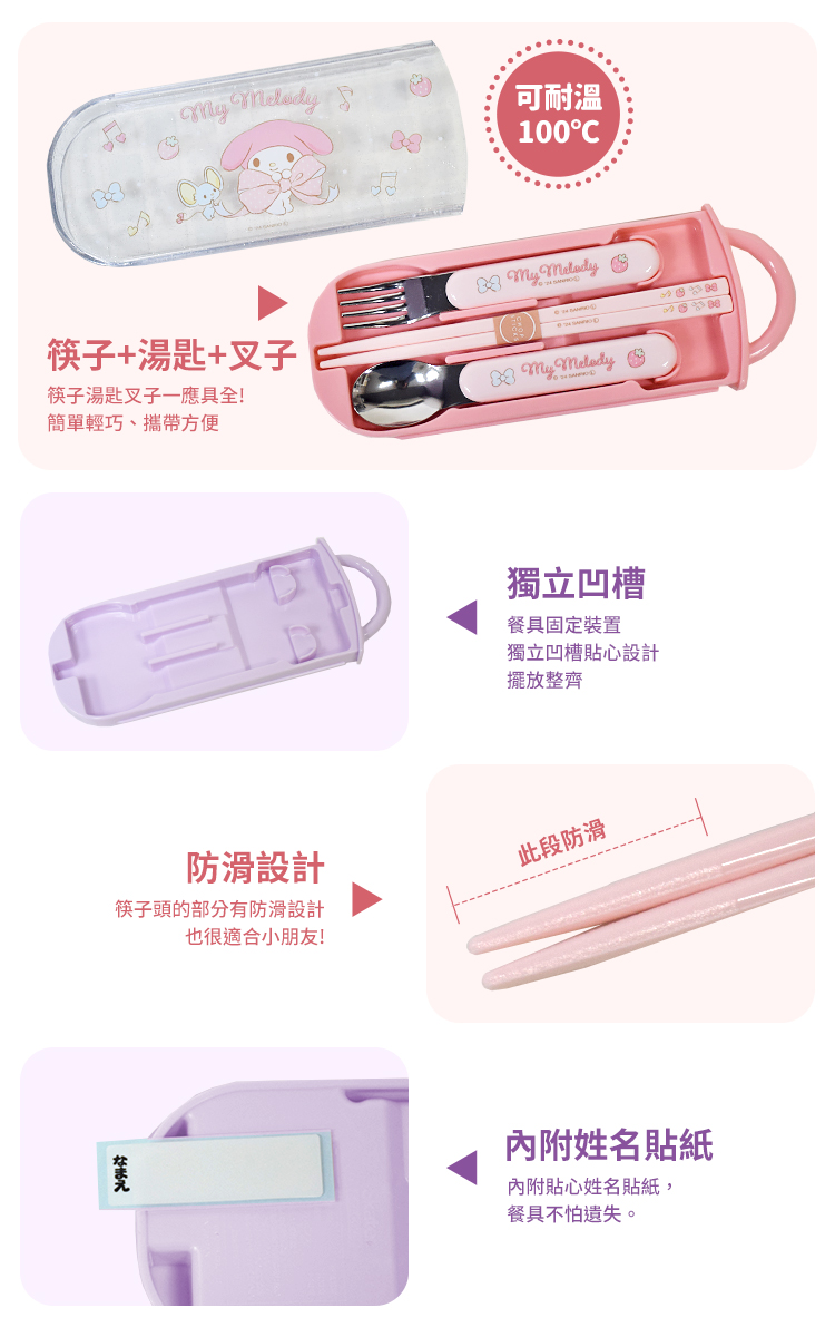 ●筷子湯匙叉子 一應具全●內附姓名貼紙,不怕遺失餐具●滑蓋式設計,收納方便,簡約輕巧●筷子頭的部分有防滑設計,方便夾取食物!