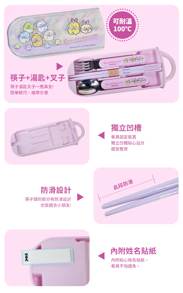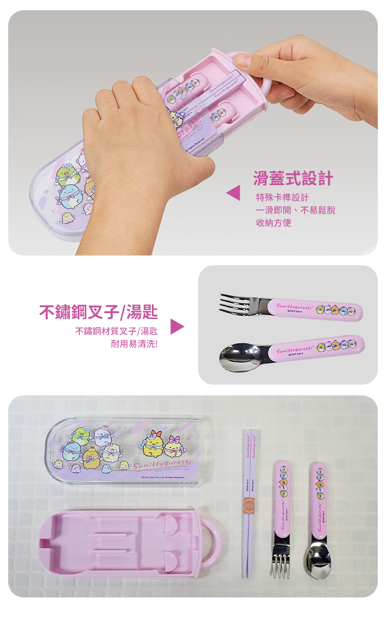 ●筷子湯匙叉子 一應具全●內附姓名貼紙,不怕遺失餐具●滑蓋式設計,收納方便,簡約輕巧●筷子頭的部分有防滑設計,方便夾取食物!