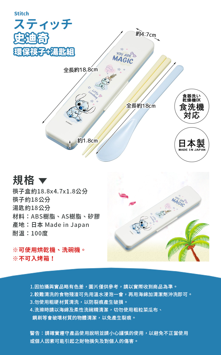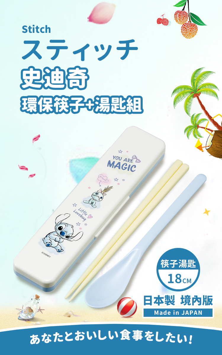【百科良品】日本製 迪士尼 史迪奇 手繪風 環保筷子+湯匙組 18CM(日本境內版)