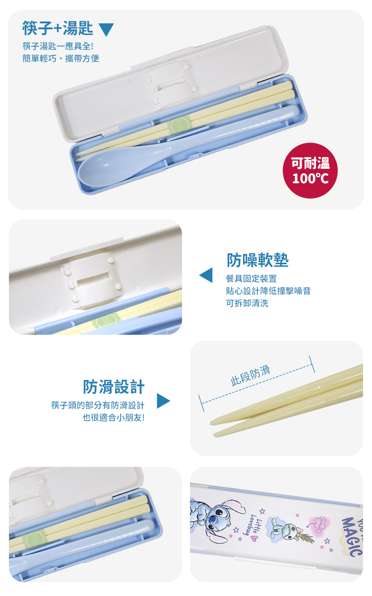 ●筷子湯匙一應具全●收納方便,簡約輕巧●貼心筷子靜音固定裝置,隨身攜帶也沒有噪音!●筷子頭的部分有防滑設計,方便夾取食物!