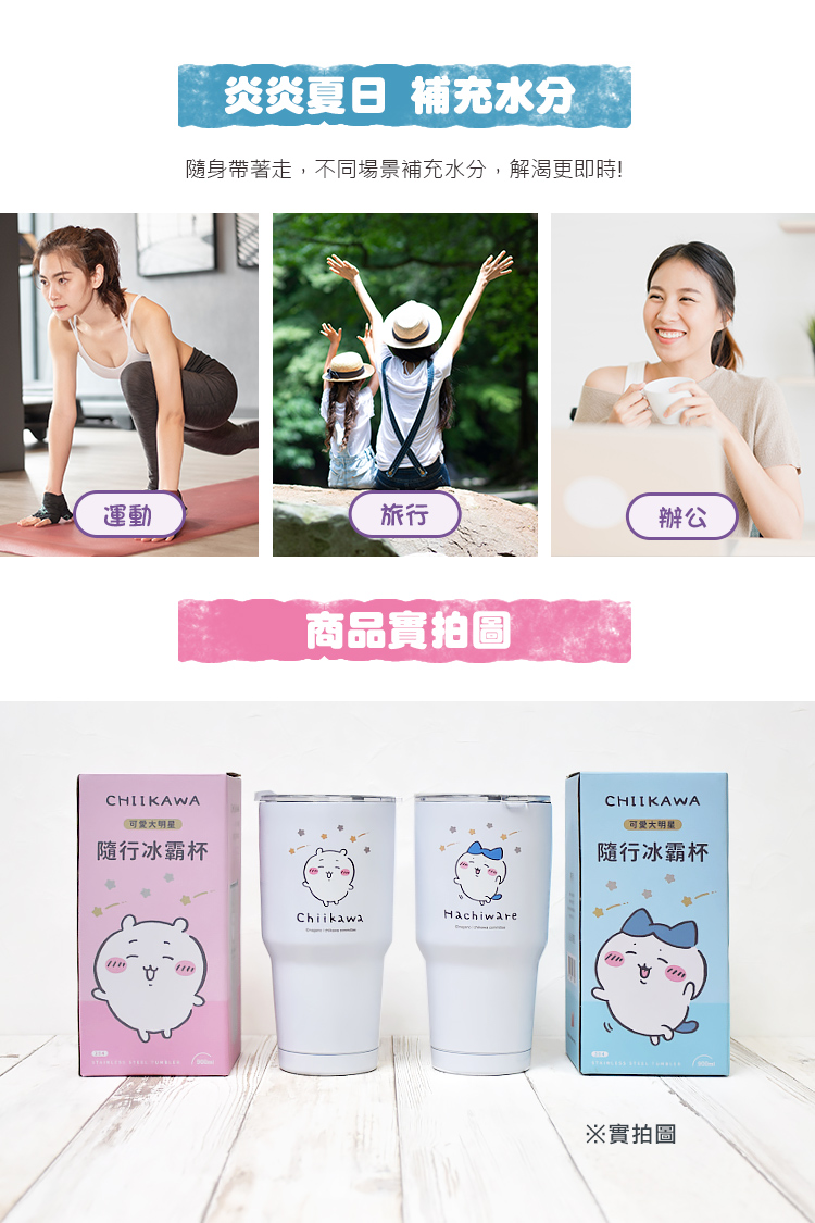 材質:杯身-內部304不鏽鋼 外部201不鏽鋼 杯蓋-PP聚丙烯 密封圈-矽膠 尺寸:杯身-約7x10x20cm(含上蓋)包裝盒尺寸:約21.5×10.5×10.5公分容量:約900ml重量:本體約320g、含包裝約400g(手工量正負誤差3%)口徑:約10cm耐熱溫度:杯身0°C~100°C 杯蓋0°C~90°C保溫效力:40℃約6小時保冷效力:5℃約6小時產地:中國授權公司:Chiikawa吉伊卡哇