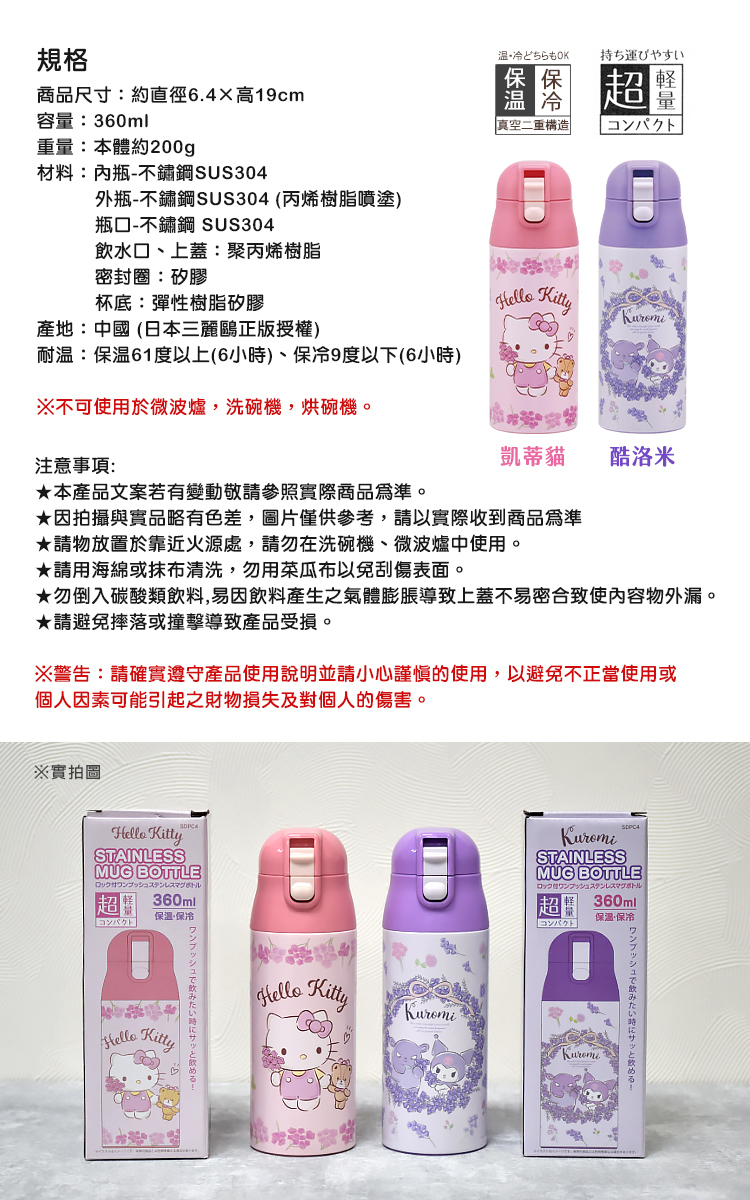 商品尺寸:約直徑6.4×高19cm包裝尺寸:7x7x20cm容量:360ml重量:本體約200g、含包裝約240g材料:內瓶-不鏽鋼SUS304 外瓶-不鏽鋼SUS304 (丙烯樹脂噴塗) 瓶口-不鏽鋼 SUS304 飲水口、上蓋:聚丙烯樹脂 密封圈:矽膠 杯底:彈性樹脂矽膠產地:中國 (日本三麗鷗正版授權)耐溫:保溫61度以上(6小時)、保冷9度以下(6小時)