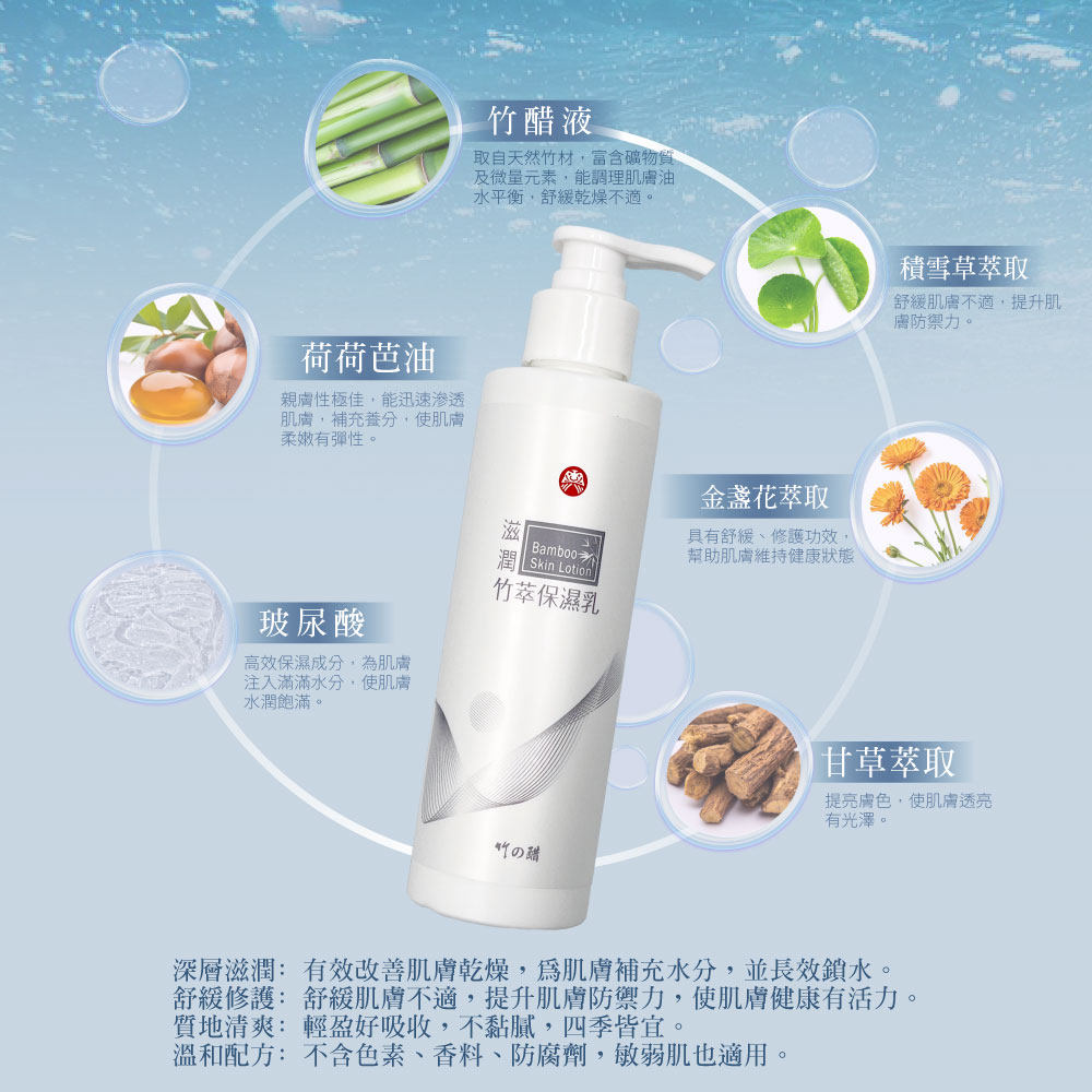 • 竹醋液: 深層保濕,舒緩肌膚,帶來自然的力量。
