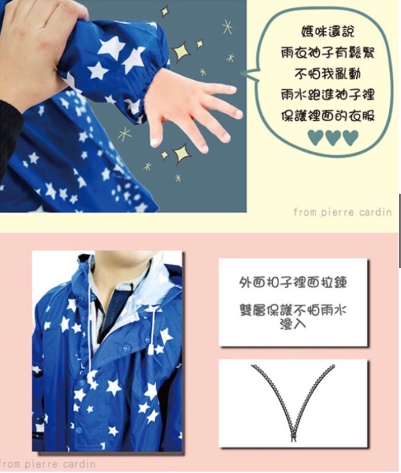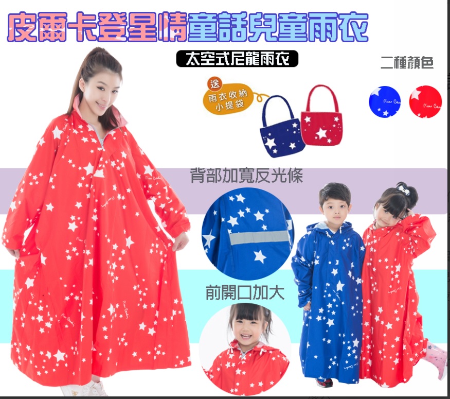 【周周生活】雨衣 兒童雨衣 現貨 雨衣一件式 背包雨衣 皮爾卡登雨衣 書包雨衣 幼兒雨衣 小孩雨衣 大童雨衣 小朋友雨衣品名:皮爾卡登夢幻之星/星情童話 成人雨衣/兒童雨衣📍商品特色大人款✔️通過SGS檢驗,符合塑化劑安全規範✔️下擺隱形百折設計,方便上下車不卡卡✔️隱藏式鬆緊袖口設計,不易進水超貼心✔️背部反光條設計,增加夜間安全✔️可收藏式帽子,依需求展開收起不糾結✔️附贈雨衣收納袋📍商品特色兒童款✔️通過SGS檢驗,符合塑化劑安全規範✔️不含塑化劑,觸感溫柔細緻,不傷害孩童稚嫩肌膚✔️前開口加大,方便安全帽穿脫✔️背後特殊加寬設計,讓兒童背書包時更加輕鬆✔️背部反光條設計,增加夜間安全✔️親子裝更添生活幸福氛圍✔️附贈雨衣收納袋✔️半前開式設計,穿脫更方便✔️外面扣子,裡層有拉鍊,雙層保護不怕雨水滲入📌商品規格材質:聚酯纖維/PVC聚氯乙烯貼合重量:700g(大人款)/600g(小孩款)建議尺寸:XS 95~115 CMS 116~135 CMM 135~150 CML 151 CM以上XL 160 CM以下2XL 160~170 CM以下3XL 170~180 CM以上門市資訊:周周生活地址: 高雄市苓雅區建國一路39號電話: 07-7903060FB粉絲專頁:周周生活 雨衣雨具 洋傘 毛巾專賣店#周周生活 #雨衣 #兒童雨衣 #現貨 #雨衣一件式 #背包雨衣 #皮爾卡登雨衣 #書包雨衣 #幼兒雨衣 #小孩雨衣 #大童雨衣 #小朋友雨衣
