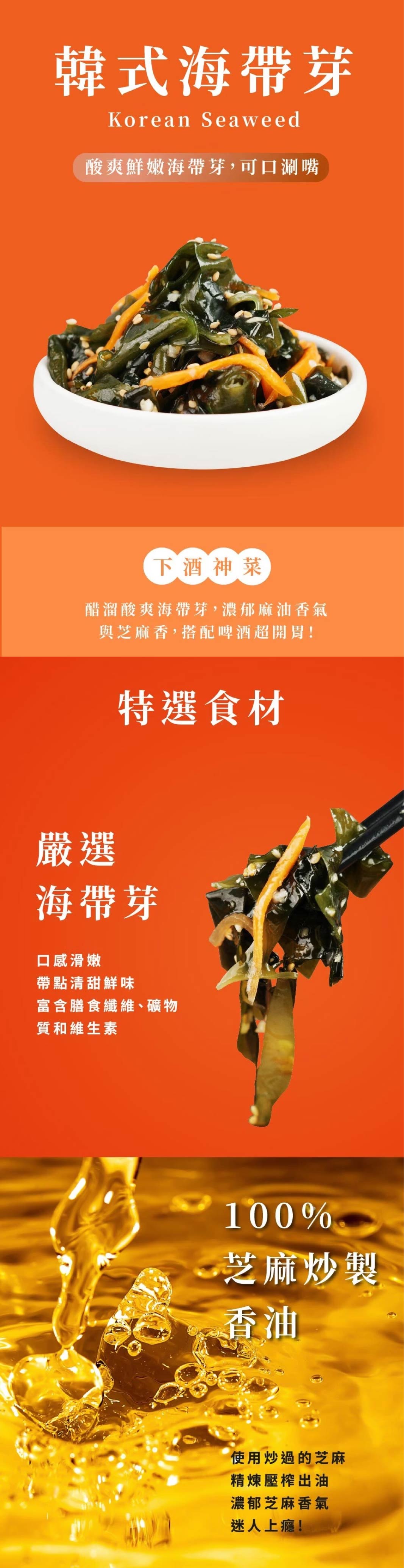 經典韓式小菜,濃郁麻油香氣,特製酸甜芝麻醬汁醃製,海帶芽口感滑順
