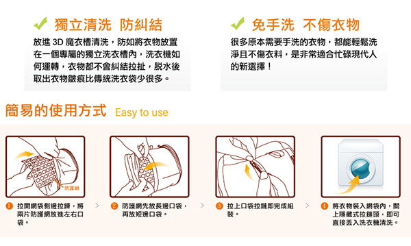 5. 洗衣機建議使用中低轉數,已達最佳洗淨及保護效果。本產品不能使用於烘衣機,使用後請放置乾燥再納。