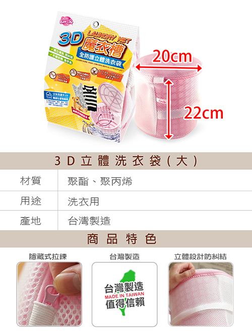 捨不得心愛的衣物被丟進洗衣機裡拉扯?那就手洗吧,但是下班回到家已經累得半死,一想到還要用手洗就渾身無力嗎?即使是偷懶,裝在洗衣袋使用洗衣機清洗,也是會有洗不乾淨的狀況,還得再搓洗過,一件事情兩遍工,簡直就是本末倒置!快使用《真心良品》可兒喜全防護3D立體洗衣袋(大)吧!立體側網設計,側網安裝步驟簡易好上手,清洗起來更潔淨!不糾結!不管是內衣、內褲、手帕、襪子、絲巾等等等使用都OK!百分百台灣製造,品質優良又耐用,讓您輕鬆洗!好EZ喔!