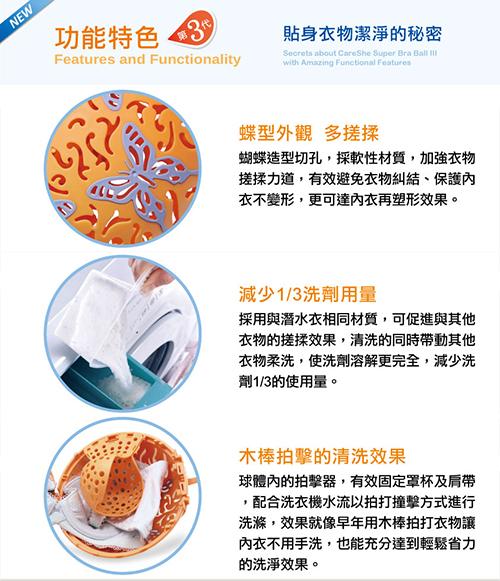 為滿足個人化及都會區空間需求,洗衣機的部分機種,廠商將其滾筒洗衣槽縮小化,推出新型迷你洗衣機,但因其洗衣槽空間太小,不適合CareShe可而喜第三代蝶舞風華內衣球於內合理運作清洗.