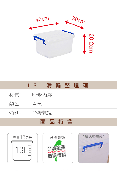 商品特色:■市場唯一可當儲水的收納箱!!■缺水時代來臨!!收納箱也可以當作儲水好幫手。■材質加厚,側邊附有扣環,不用擔心容易破損。■除了可以收納換季商品外,也可當作儲水箱功能。■商品可以向上堆疊,不用擔心太占位置。■底部有滑輪,推來推去也不用擔心太費力!■13L可放置書籍、美術用品、文具等皆適宜。■百分百台灣製造生產,材質堅韌耐用,品質優良!■共有六種規格可選,可任意搭配使用,讓您收納更完善。商品規格: