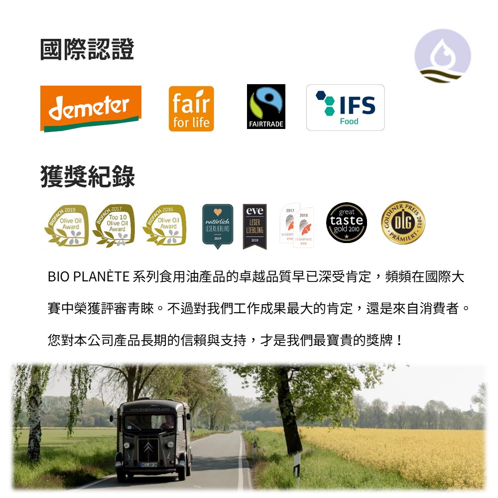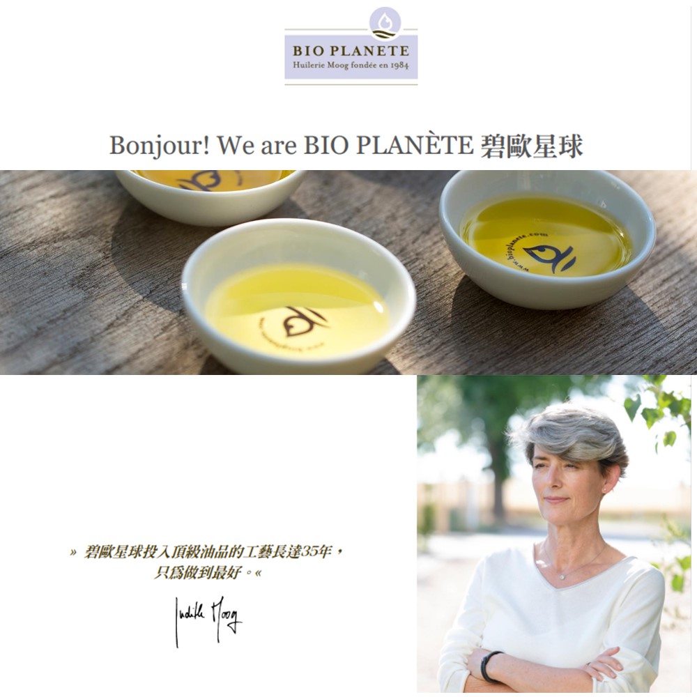 碧歐星球」 顧名思義在於追求天然生活的力行者! 當創辦人Franz Moog 初訪南法 Cather 地區 (鄰近卡爾卡松 Carcassonne 和土魯斯 Toulouse 之間),當地日照豐沛的迷人鄉間田野,促使他興起發展產業的契機。從最初的 "Domaine de la Planète" 農莊開始發展,到目前已推出備受國際間高度肯定的「碧歐星球 BIO PLANÈTE」品牌,儼然已在食用油品當中建立高優質的形象。農業目的在於重建生產與消耗的生態平衡,BIO PLANÈTE 堅信以此作法,大自然生態才得以永續長存,而地球上的子民也才能獲得優質的健康飲食。BIO PLANÈTE系列食用油產品的卓越品質早已深受肯定,頻頻在國際大賽中榮獲評審青睞。法國AVPA國際橄欖油競賽大獎、英國超級美味金牌獎(Great Taste Gold Award)等等。負責評審的專家們一致認為BIO PLANÈTE在公司經營的永續性、品牌塑造的嚴謹度、產品組合結構的清晰度等方面,均領先群雄。